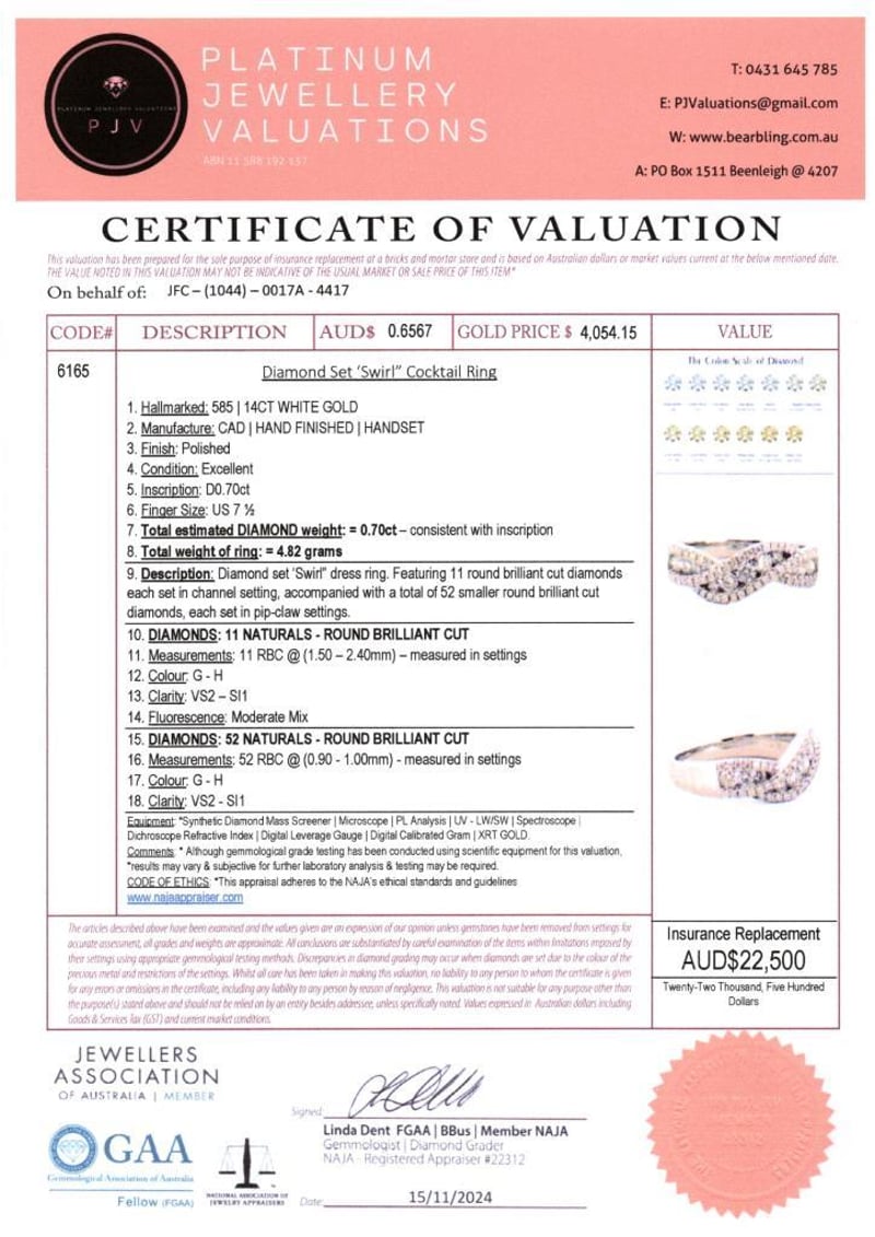 14CT WHITE GOLD DIAMOND SWIRL INSPIRED RING Featuring, 63 Round Brilliant Cut Diamonds (0.70Ct Tdw, G-H Colour, Vs2-Si1 Clarity), Bead Set. Ring Size O. Valuations Provided by an Independent Third-Party Professional Not Directly Associated With Lloyds Auctions at AUD $22500This valuation has been conducted by an independent third-party professional. The valuation amount is an assessment by the issuing valuer and does not reflect the auction value of the item. Any inquiries regarding the valuation should be directed to the issuing valuer (refer to contact details on the certificate), as Lloyds Auctions has no affiliation or influence over the valuation, the valuer, or the stated amount. Condition: Good - Refer Images 0586317+1678