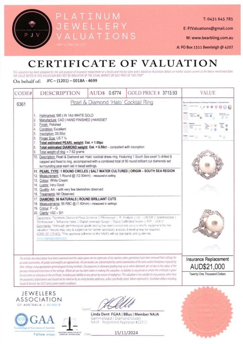 14CT WHITE GOLD PEARL AND DIAMOND DRESS RING Featuring Centre, One Round, White Cream South Sea Cultured Pearl (12.00Mm Size, Aa Grade), Post Set, With 56 Round Brilliant Cut Diamonds (0.50Ct Tdw, F-G Colour, Vs2-Si1 Clarity), Bead Set. Ring Size O. Valuations Provided by an Independent Third-Party Professional Not Directly Associated With Lloyds Auctions at AUD $21000This valuation has been conducted by an independent third-party professional. The valuation amount is an assessment by the issuing valuer and does not reflect the auction value of the item. Any inquiries regarding the valuation should be directed to the issuing valuer (refer to contact details on the certificate), as Lloyds Auctions has no affiliation or influence over the valuation, the valuer, or the stated amount. Condition: Good - Refer Images 0586317+1677