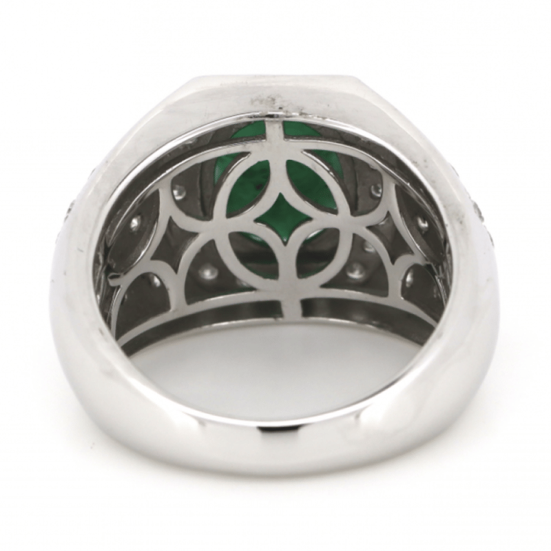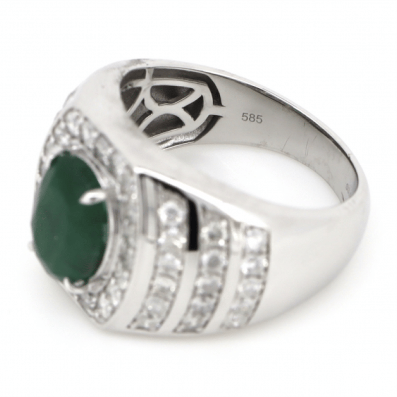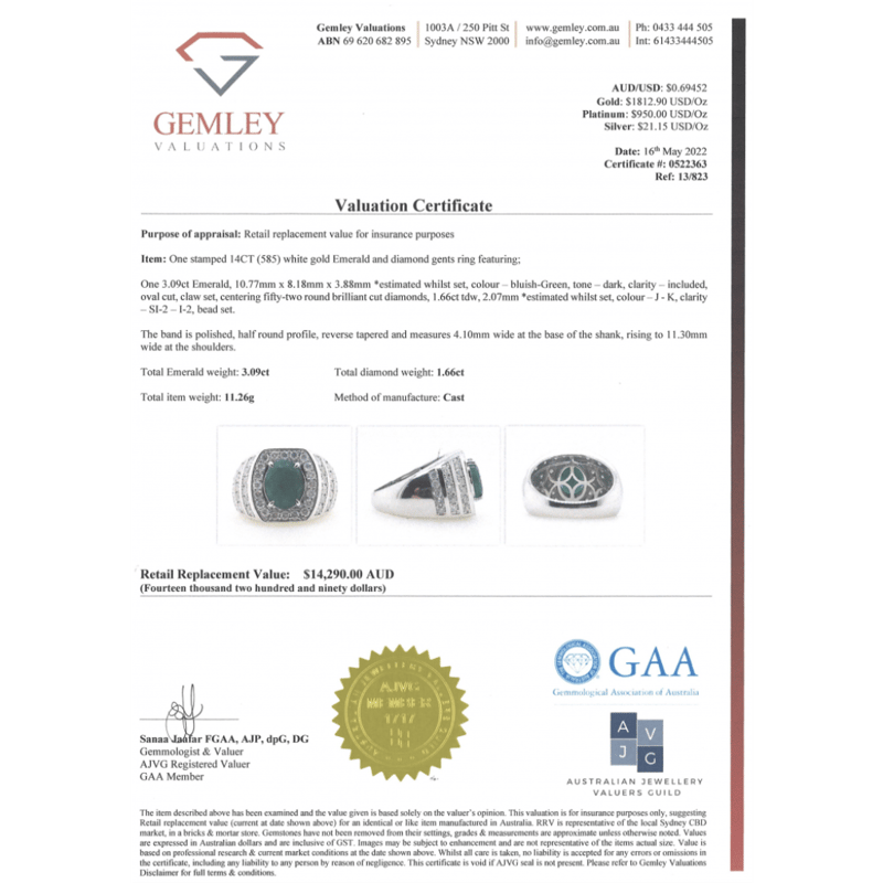 14K WHITE GOLD, EMERALD AND DIAMOND, GENTS RING. The Centre Features, One Oval Cut, Dark Bluish-Green, Emerald (3.09Ct, Included), Claw Set. Surrounding The Centre In A Halo And Decorating The Shoulders Are, 52 Round Brilliant Cut, Diamonds (1.66Ct Tdw, J-K Colour, Si2-I2 Clarity), Bead Set. Ring Size S. Jewellery Valuations Provided By A Third Party Professional Not Directly Associated With Lloyds Auctions at AUD $14,290.00This Insurance Valuation has been provided by a registered Jewellery Valuer and is intended for insurance purposes only. The valuation amount has no bearing on the auction value of the item. Any questions regarding the valuation should be directed to the issuing Valuer (refer to contact details on the certificate) as Lloyds have no association or relationship with the Valuer or the valuation amount contained within the valuation. Condition: GOOD 0645893+1695