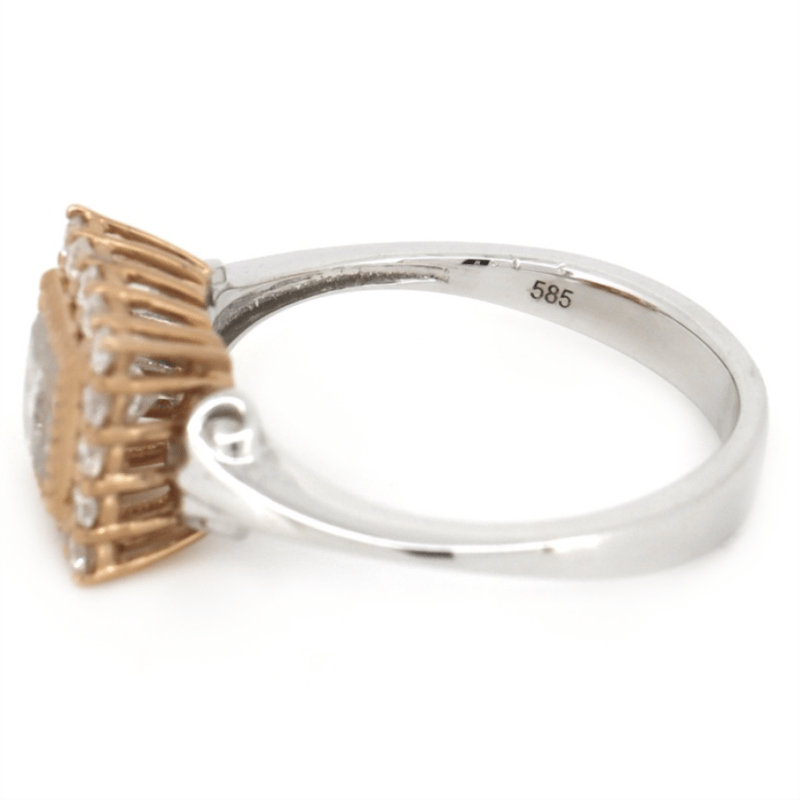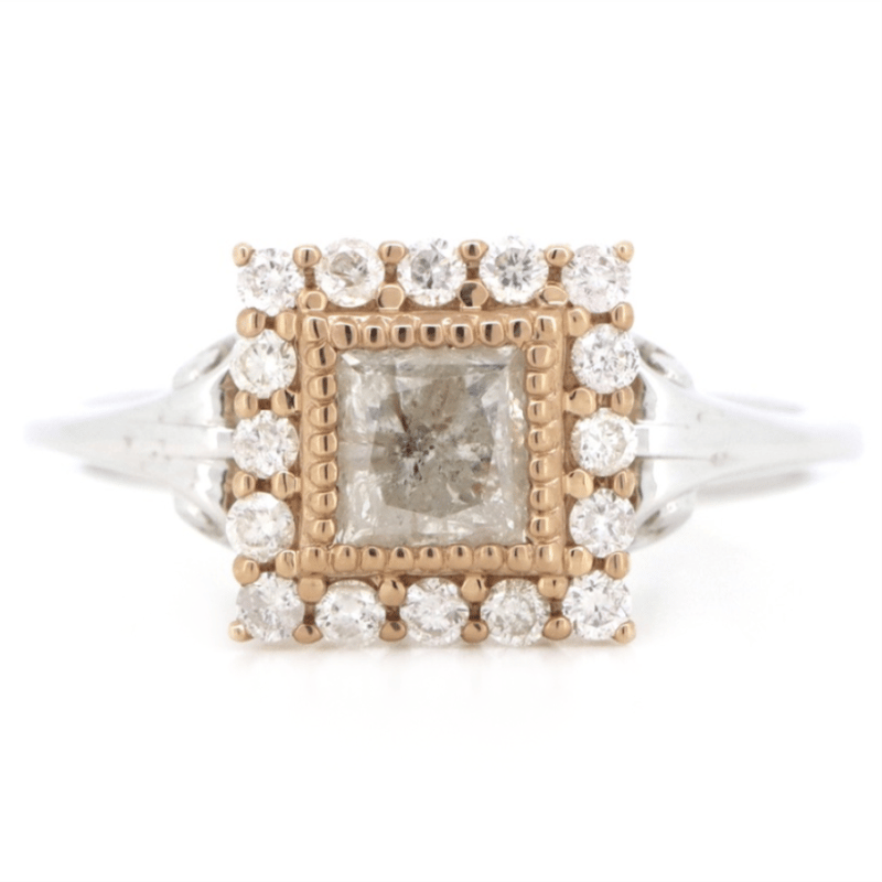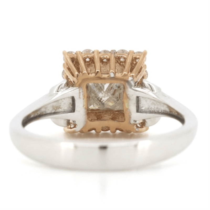 14K WHITE/ROSE GOLD AND DIAMOND, HALO RING. The Centre Features, One Princess Cut, Diamond (0.84Ct, K-L Colour, P2-P3 Clarity), Bezel Set. Surrounding The Centre In A Halo Are, 16 Round Brilliant Cut, Diamonds (0.27Ct Tdw, I-K Colour, Si2-P2 Clarity), Claw Set. Ring Size M 1/2. Jewellery Valuations Provided By A Third Party Professional Not Directly Associated With Lloyds Auctions at AUD $10,650.00This Insurance Valuation has been provided by a registered Jewellery Valuer and is intended for insurance purposes only. The valuation amount has no bearing on the auction value of the item. Any questions regarding the valuation should be directed to the issuing Valuer (refer to contact details on the certificate) as Lloyds have no association or relationship with the Valuer or the valuation amount contained within the valuation. Condition: GOOD 0645893+1690