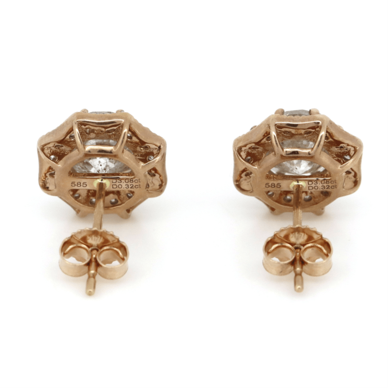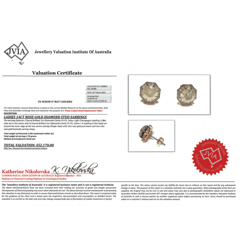 14K ROSE GOLD, CHAMPAGNE DIAMOND, HALO STUD EARRINGS. The Centres Feature, 2 Round Brilliant Cut, Light Champagne, Diamonds (3.08Ct Tdw, P2-P3 Clarity), Claw Set. Surrounding The Centres In Halos Are, 32 Round Brilliant Cut, Diamonds (0.32Ct Tdw, J-K Colour, P1-P2 Clarity), Bead Set. The Earrings Have Post Backs With 14K Rose Gold Butterfly Clasps. Valuations Provided by an Independent Third-Party Professional Not Directly Associated With Lloyds Auctions at AUD $$52,170.00This valuation has been conducted by an independent third-party professional. The valuation amount is an assessment by the issuing valuer and does not reflect the auction value of the item. Any inquiries regarding the valuation should be directed to the issuing valuer (refer to contact details on the certificate), as Lloyds Auctions has no affiliation or influence over the valuation, the valuer, or the stated amount. Condition: Good - Refer Images 0+1476