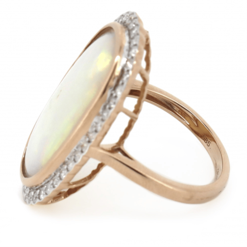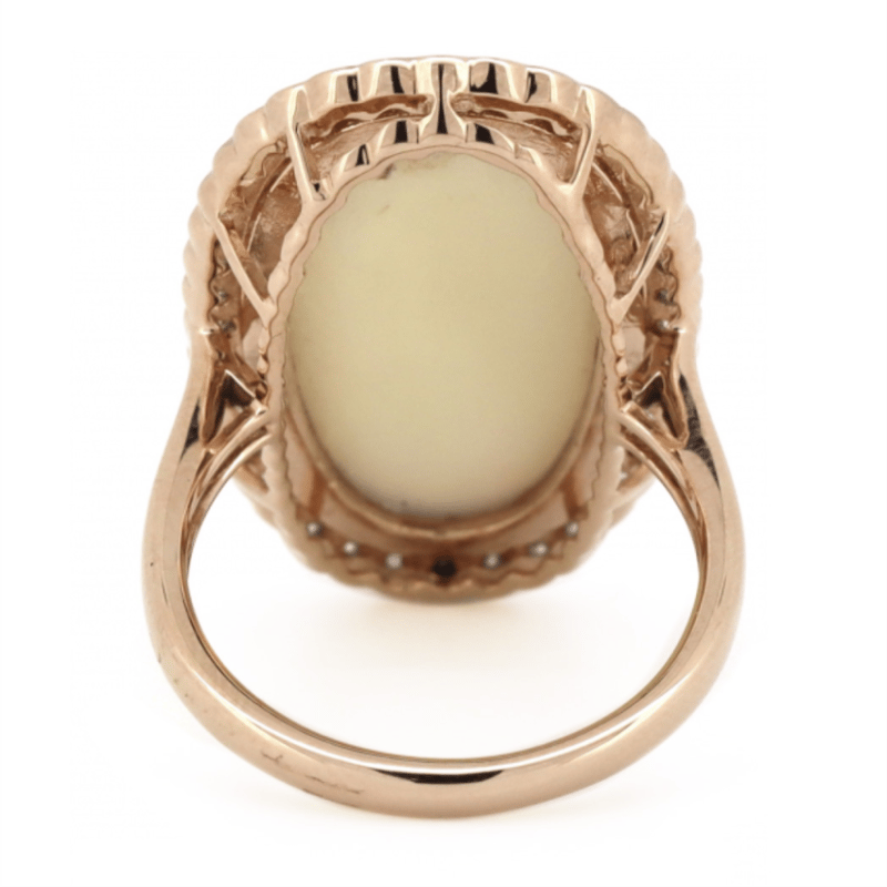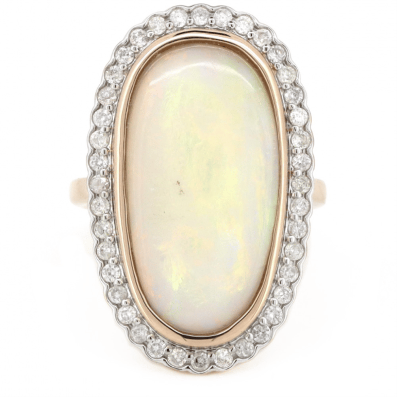 14K ROSE GOLD, 5.86CT AUSTRALIAN COOBER PEDY OPAL AND DIAMOND, HALO STATEMENT RING. The Centre Features, One Oval Cabochon Cut, Australian Cooper Pedy Opal (5.86Ct, Green, Violet, Yellow, Orange And Blue Strong Colour Play), Bezel Set. Surrounding The Centre In A Halo Are, 40 Round Brilliant Cut, Diamonds (0.54Ct Tdw, J-K Colour, Si2-I2 Clarity), Semi-Bezel/Bead Set In White Gold. Ring Size M 1/2. Valuations Provided by an Independent Third-Party Professional Not Directly Associated With Lloyds Auctions at AUD $$16,890.00This valuation has been conducted by an independent third-party professional. The valuation amount is an assessment by the issuing valuer and does not reflect the auction value of the item. Any inquiries regarding the valuation should be directed to the issuing valuer (refer to contact details on the certificate), as Lloyds Auctions has no affiliation or influence over the valuation, the valuer, or the stated amount. Condition: Good - Refer Images 0+1409