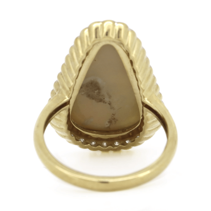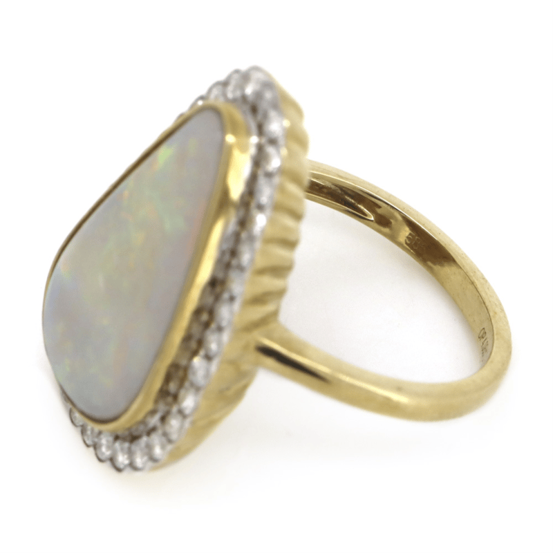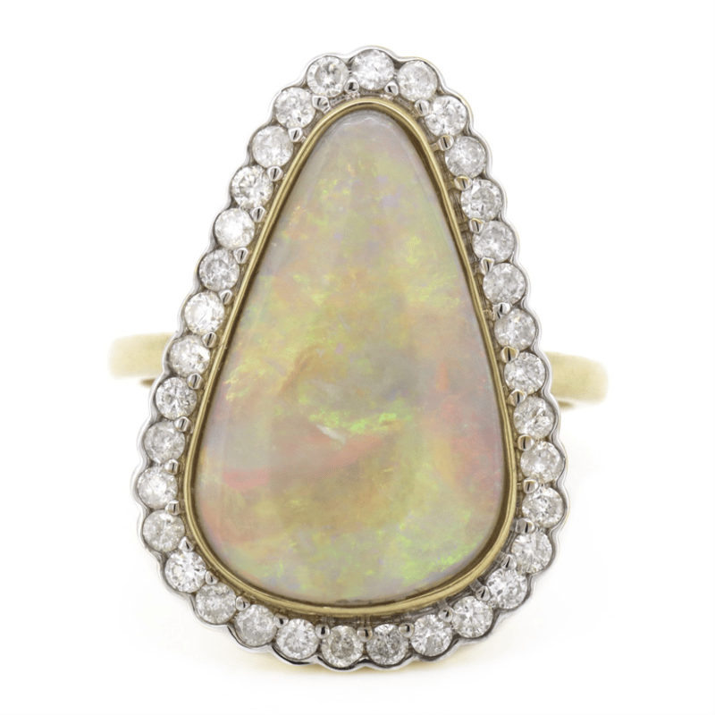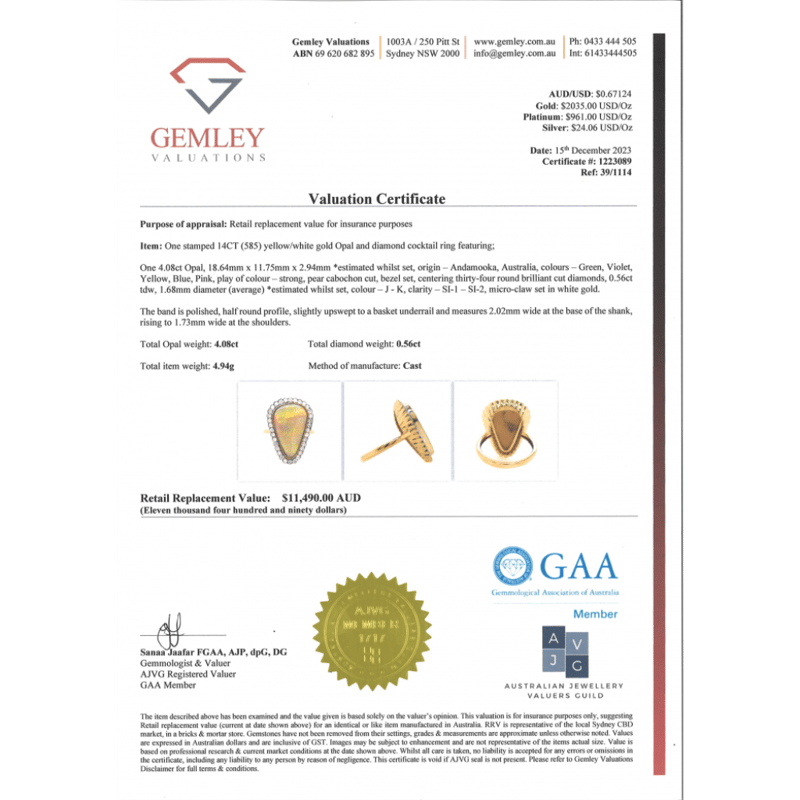 14K YELLOW GOLD, 4.08CT AUSTRALIAN ANDAMOOKA OPAL AND DIAMOND, HALO RING. The Centre Features, One Pear Cabochon Cut, Australian Andamooka Opal (4.08Ct, Green-Violet-Yellow-Blue-Pink Strong Colour Play), Bezel Set. Surrounding The Centre In A Halo Are, 34 Round Brilliant Cut, Diamonds (0.56Ct Tdw, J-K Colour, Si1-Si2 Clarity), Micro-Claw Set In White Gold. Ring Size L 1/2. Valuations Provided by an Independent Third-Party Professional Not Directly Associated With Lloyds Auctions at AUD $$11,490.00This valuation has been conducted by an independent third-party professional. The valuation amount is an assessment by the issuing valuer and does not reflect the auction value of the item. Any inquiries regarding the valuation should be directed to the issuing valuer (refer to contact details on the certificate), as Lloyds Auctions has no affiliation or influence over the valuation, the valuer, or the stated amount. Condition: Good - Refer Images 0+1441