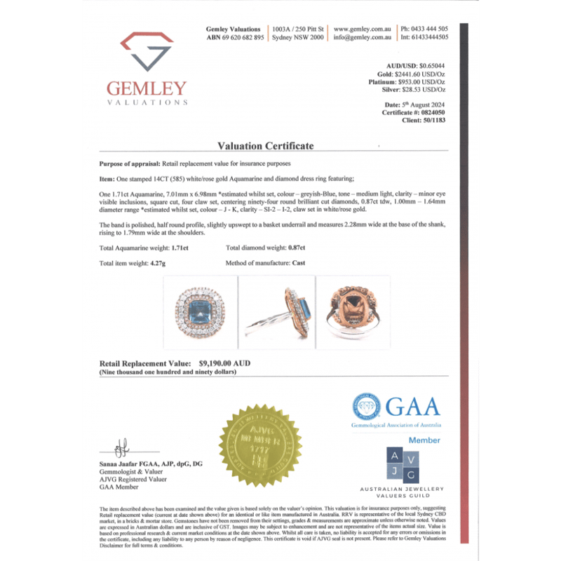 14K ROSE/WHITE GOLD, AQUAMARINE AND DIAMOND, TRIPLE HALO RING. The Centre Features, One Square Cut, Medium Light Greyish-Blue, Aquamarine (1.71Ct Tsw, Minor Eye Visible Inclusions), 4 Claw Set. Surrounding The Centre In A Triple Halo Are, 94 Round Brilliant Cut, Diamonds (0.87Ct Tdw, J-K Colour, Si2-I2 Clarity), Claw Set In White/Rose Gold. Ring Size L. Valuations Provided by an Independent Third-Party Professional Not Directly Associated With Lloyds Auctions at AUD $$9,190.00This valuation has been conducted by an independent third-party professional. The valuation amount is an assessment by the issuing valuer and does not reflect the auction value of the item. Any inquiries regarding the valuation should be directed to the issuing valuer (refer to contact details on the certificate), as Lloyds Auctions has no affiliation or influence over the valuation, the valuer, or the stated amount. Condition: Good - Refer Images 0+1403