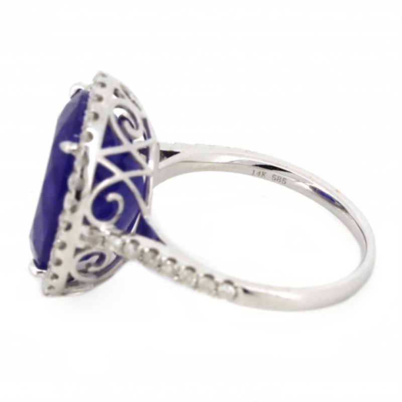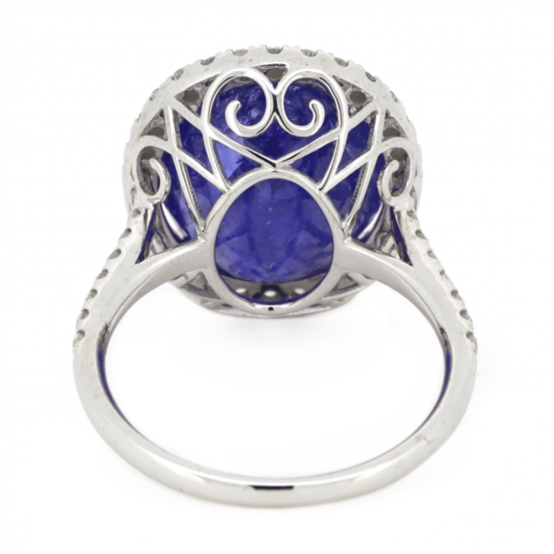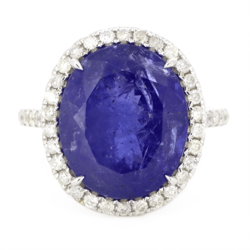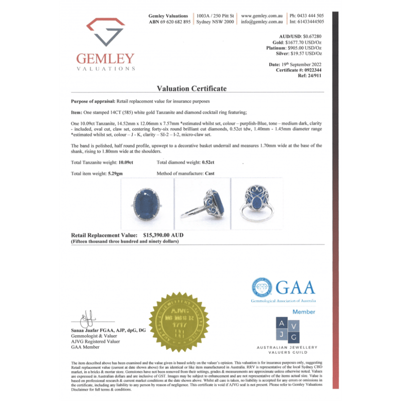 14K WHITE GOLD, 10. The Centre Features, One Oval Cut, Purplish-Blue, Tanzanite (10.09Ct, Included), 4 Claw Set. Surrounding The Centre In A Halo And Decorating The Band Are, 46 Round Brilliant Cut, Diamonds (0.52Ct Tdw, J-K Colour, Si2-I2 Clarity), Micro-Claw Set. Ring Size M 1/2.The Tanzanite Has Some Very Small Natural Inclusions That Have Reached The Surface. Valuations Provided by an Independent Third-Party Professional Not Directly Associated With Lloyds Auctions at AUD $$15,390.00This valuation has been conducted by an independent third-party professional. The valuation amount is an assessment by the issuing valuer and does not reflect the auction value of the item. Any inquiries regarding the valuation should be directed to the issuing valuer (refer to contact details on the certificate), as Lloyds Auctions has no affiliation or influence over the valuation, the valuer, or the stated amount. Condition: Good - Refer Images 0+1423