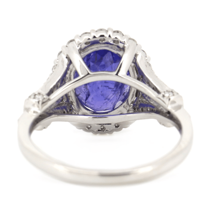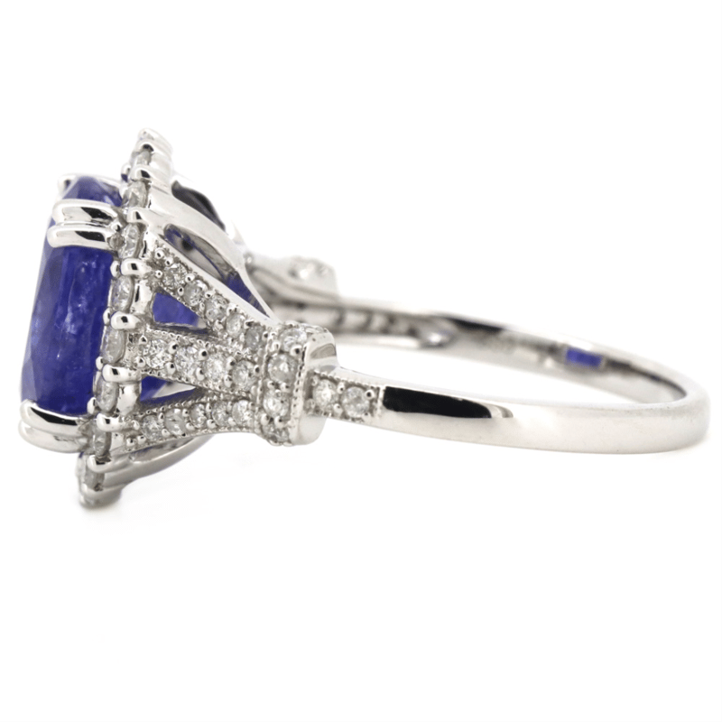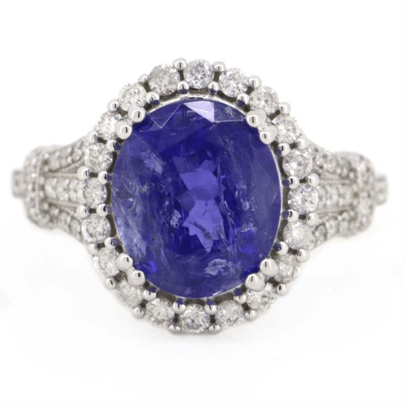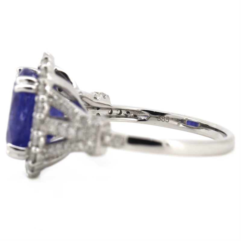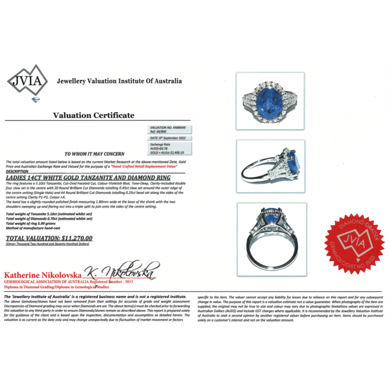14K WHITE GOLD, TANZANITE AND DIAMOND, HALO RING. The Centre Features, One Oval Faceted Cut, Deep Violetish-Blue, Tanzanite (5.10Ct, Included), 4 Claw Set. Surrounding The Centre In A Halo And Decorating The Setting Are, 64 Round Brilliant Cut, Diamonds (0.70Ct Tdw, J-K Colour, P1-P2 Clarity), Bead Set. Ring Size Q. Valuations Provided by an Independent Third-Party Professional Not Directly Associated With Lloyds Auctions at AUD $$11,270.00This valuation has been conducted by an independent third-party professional. The valuation amount is an assessment by the issuing valuer and does not reflect the auction value of the item. Any inquiries regarding the valuation should be directed to the issuing valuer (refer to contact details on the certificate), as Lloyds Auctions has no affiliation or influence over the valuation, the valuer, or the stated amount. Condition: Good - Refer Images 0+1497