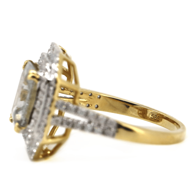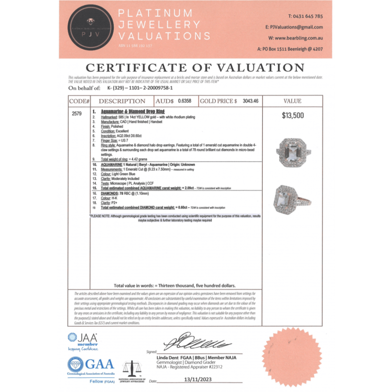 14K YELLOW GOLD, AQUAMARINE AND DIAMOND, DOUBLE HALO RING. The Centre Features, One Emerald Cut, Light Green Blue, Aquamarine (2.09Ct, Moderately Included), Double 4 Claw Set. Surrounding The Centre In A Double Halo And Decorating The Split Band Are, 78 Round Brilliant Cut, Diamonds (0.60Ct Tdw, H-K Colour, P2+ Clarity), Micro-Bead Set. Ring Size N. Valuations Provided by an Independent Third-Party Professional Not Directly Associated With Lloyds Auctions at AUD $$13,500.00This valuation has been conducted by an independent third-party professional. The valuation amount is an assessment by the issuing valuer and does not reflect the auction value of the item. Any inquiries regarding the valuation should be directed to the issuing valuer (refer to contact details on the certificate), as Lloyds Auctions has no affiliation or influence over the valuation, the valuer, or the stated amount. Condition: Good - Refer Images 0+1448