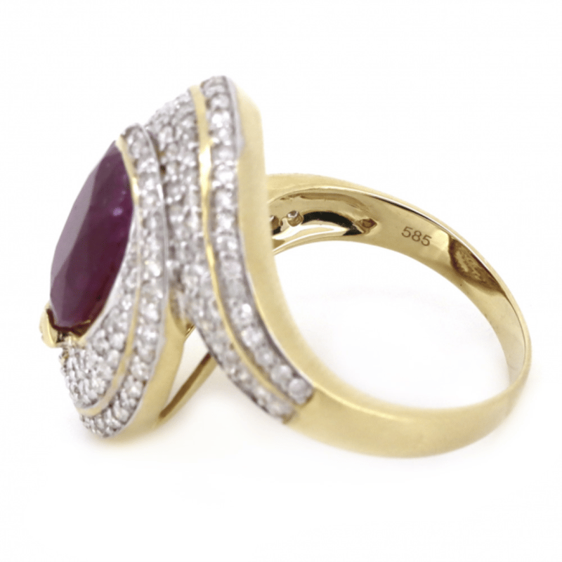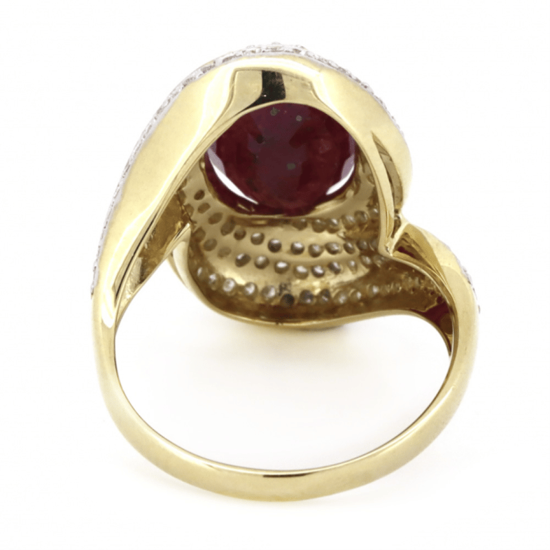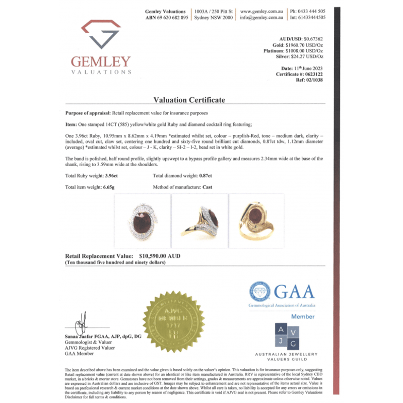 14K YELLOW/WHITE GOLD, RUBY AND DIAMOND, DRESS RING. The Centre Features, One Oval Cut, Medium Dark Purplish-Red, Ruby (3.96Ct, Included), Claw Set. Encompassing The Centre Are, 165 Round Brilliant Cut, Diamonds (0.87Ct Tdw, J-K Colour, Si2-I2 Clarity), Bead Set In White Gold. Ring Size O. Valuations Provided by an Independent Third-Party Professional Not Directly Associated With Lloyds Auctions at AUD $$10,590.00This valuation has been conducted by an independent third-party professional. The valuation amount is an assessment by the issuing valuer and does not reflect the auction value of the item. Any inquiries regarding the valuation should be directed to the issuing valuer (refer to contact details on the certificate), as Lloyds Auctions has no affiliation or influence over the valuation, the valuer, or the stated amount. Condition: Good - Refer Images 0+1412