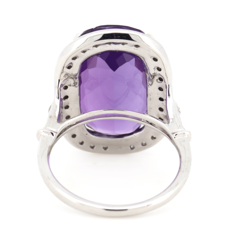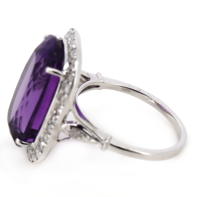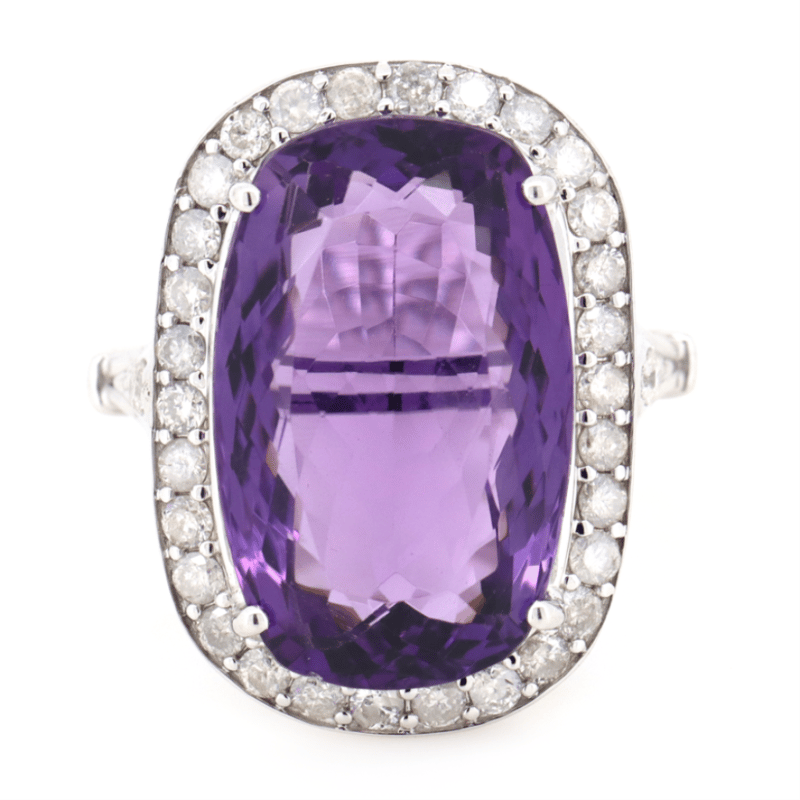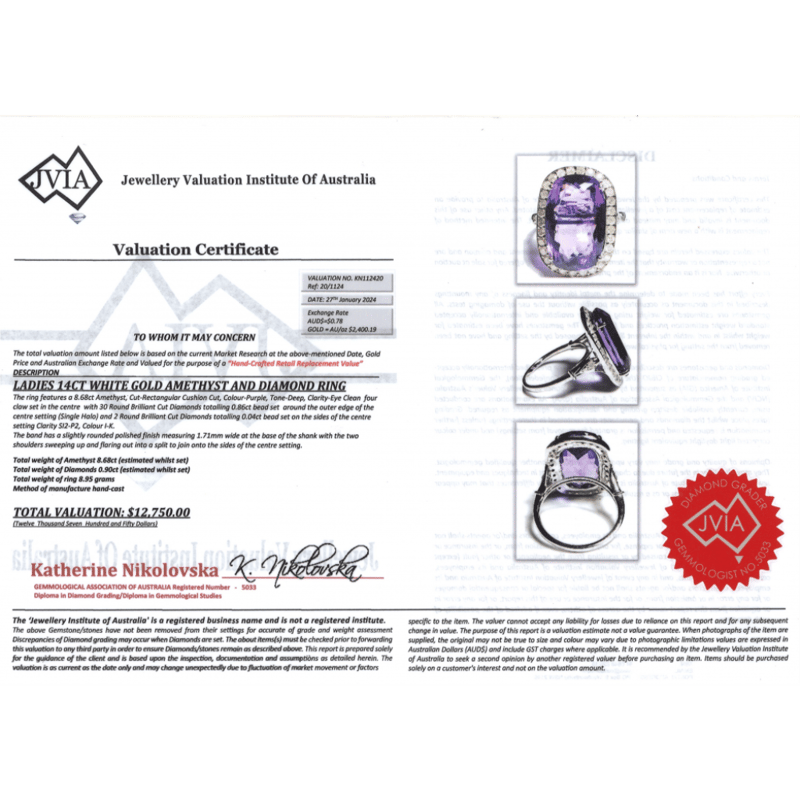 14K WHITE GOLD, 8.68CT AMETHYST AND DIAMOND, STATEMENT RING. The Centre Features, One Rectangular Cushion Cut, Deep Purple, Amethyst (8.68Ct, Eye Clean Clarity), Claw Set. Surrounding The Centre And Decorating The Shoulders Are, 32 Round Brilliant Cut, Diamonds (0.90Ct Tdw, I-K Colour, Si2-P2 Clarity), Bead Set. Ring Size P. Valuations Provided by an Independent Third-Party Professional Not Directly Associated With Lloyds Auctions at AUD $$12,750.00This valuation has been conducted by an independent third-party professional. The valuation amount is an assessment by the issuing valuer and does not reflect the auction value of the item. Any inquiries regarding the valuation should be directed to the issuing valuer (refer to contact details on the certificate), as Lloyds Auctions has no affiliation or influence over the valuation, the valuer, or the stated amount. Condition: Good - Refer Images 0+1467