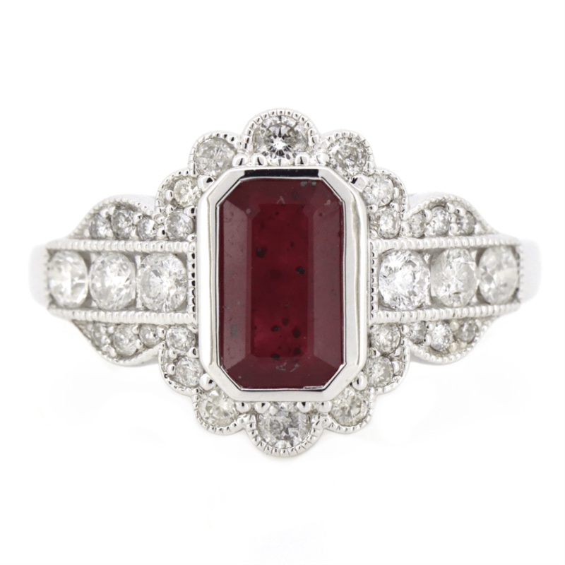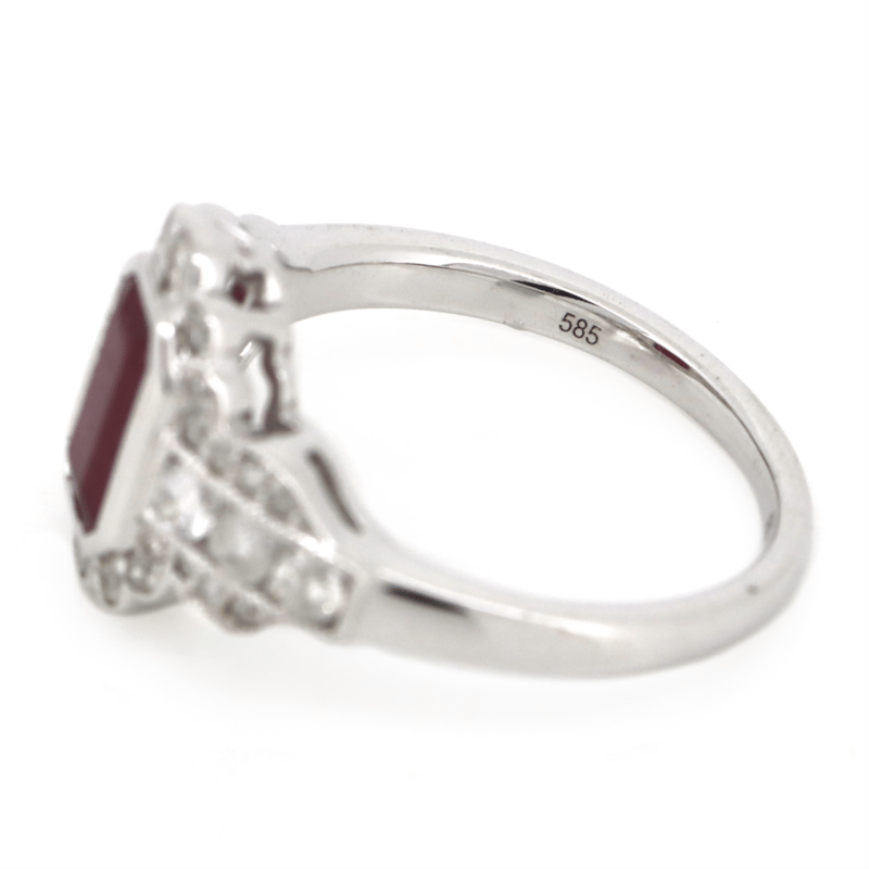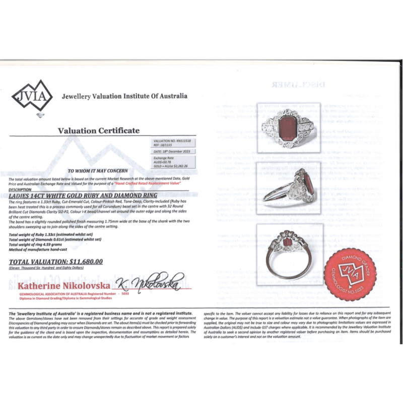 14K WHITE GOLD, RUBY AND DIAMOND, RING. The Centre Features, One Emerald Cut, Deep Pinkish-Red, Ruby (1.33Ct, Included, Heat Enhanced), Bezel Set. Surrounding The Centre Are, 32 Round Brilliant Cut, Diamonds (0.61Ct Tdw, I-K Colour, Si2-P2 Clarity), Bead/Channel Set. Ring Size N. Valuations Provided by an Independent Third-Party Professional Not Directly Associated With Lloyds Auctions at AUD $$11,680.00This valuation has been conducted by an independent third-party professional. The valuation amount is an assessment by the issuing valuer and does not reflect the auction value of the item. Any inquiries regarding the valuation should be directed to the issuing valuer (refer to contact details on the certificate), as Lloyds Auctions has no affiliation or influence over the valuation, the valuer, or the stated amount. Condition: Good - Refer Images 0+1433
