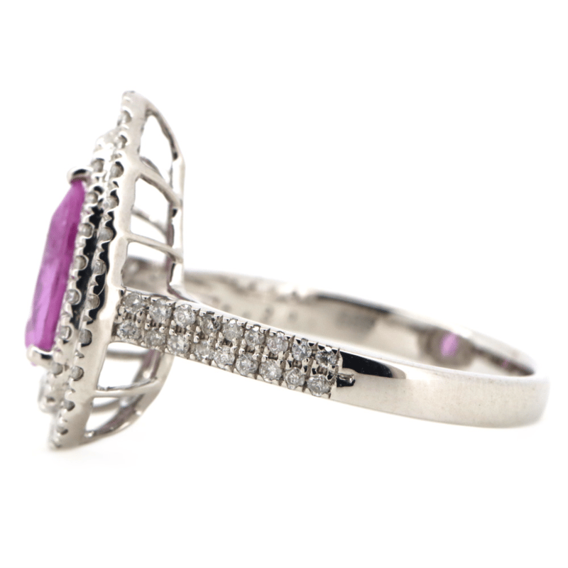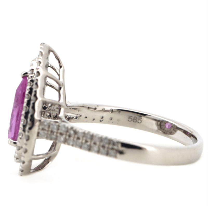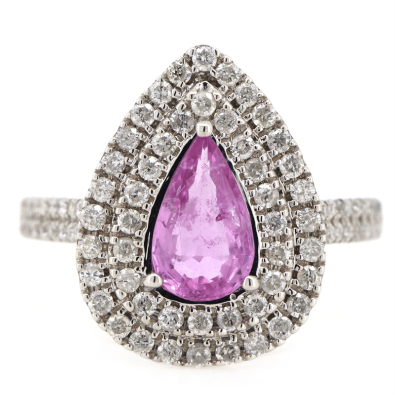 14K WHITE GOLD, PINK SAPPHIRE AND DIAMOND, DOUBLE HALO RING. The Centre Features, One Pear Cut, Medium Reddish-Pink, Sapphire (0.95Ct, Minor Eye Visible Inclusions), Claw Set. Surrounding The Centre In A Double Halo And Decorating The Split Band Are, 84 Round Brilliant Cut, Diamonds (0.62Ct Tdw, J-K Colour, Si2-I2 Clarity), Micro-Claw Set. Ring Size N. Valuations Provided by an Independent Third-Party Professional Not Directly Associated With Lloyds Auctions at AUD $$5,890.00This valuation has been conducted by an independent third-party professional. The valuation amount is an assessment by the issuing valuer and does not reflect the auction value of the item. Any inquiries regarding the valuation should be directed to the issuing valuer (refer to contact details on the certificate), as Lloyds Auctions has no affiliation or influence over the valuation, the valuer, or the stated amount. Condition: Good - Refer Images 0+1495