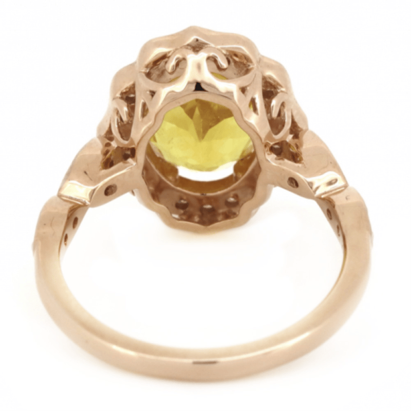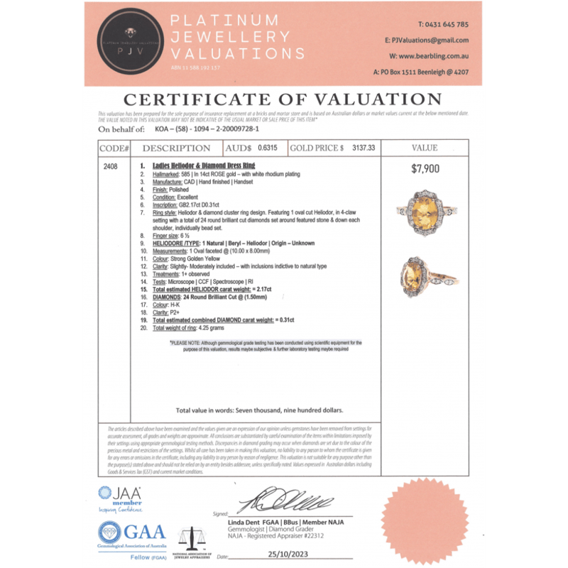 14K ROSE GOLD, HELIODOR AND DIAMOND, RING. The Centre Features, One Oval Faceted Cut, Strong Golden Yellow, Heliodor (2.17Ct, Slightly-Moderately Included, Enhanced), Claw Set. Surrounding The Centre In A Halo And Decorating The Band Are, 24 Round Brilliant Cut, Diamonds (0.31Ct Tdw, H-K Colour, P2+ Clarity), Bead Set. Ring Size M 1/2. Valuations Provided by an Independent Third-Party Professional Not Directly Associated With Lloyds Auctions at AUD $$7,900.00This valuation has been conducted by an independent third-party professional. The valuation amount is an assessment by the issuing valuer and does not reflect the auction value of the item. Any inquiries regarding the valuation should be directed to the issuing valuer (refer to contact details on the certificate), as Lloyds Auctions has no affiliation or influence over the valuation, the valuer, or the stated amount. Condition: Good - Refer Images 0+1443