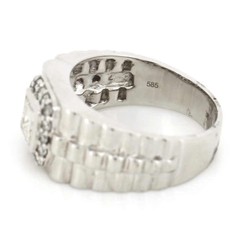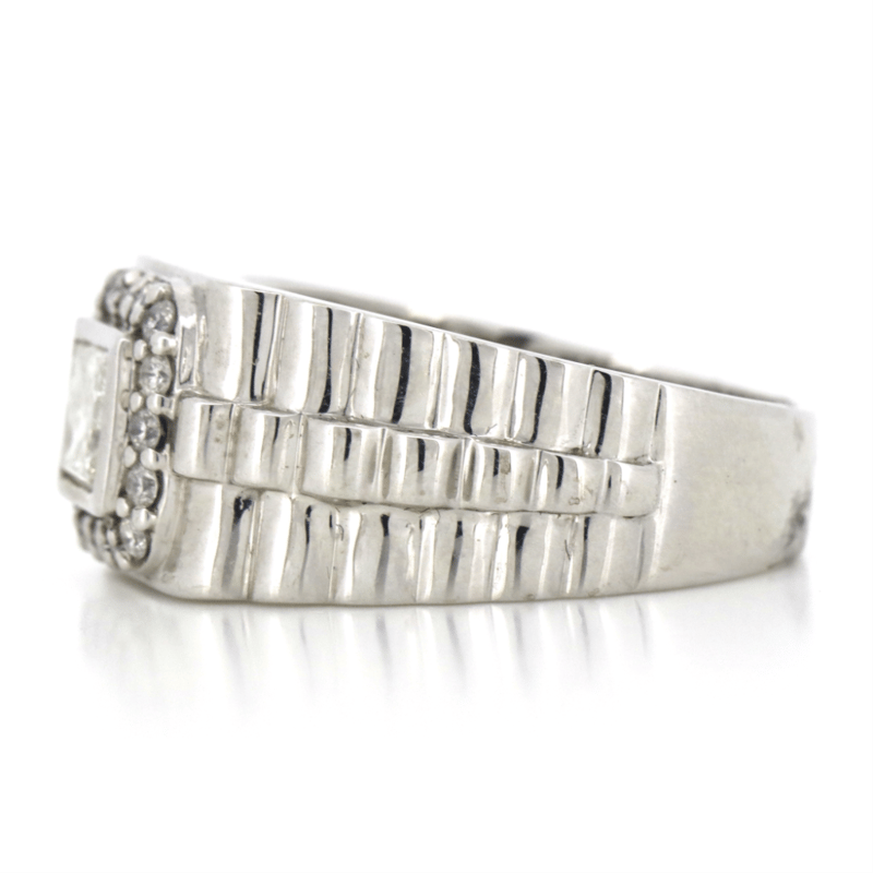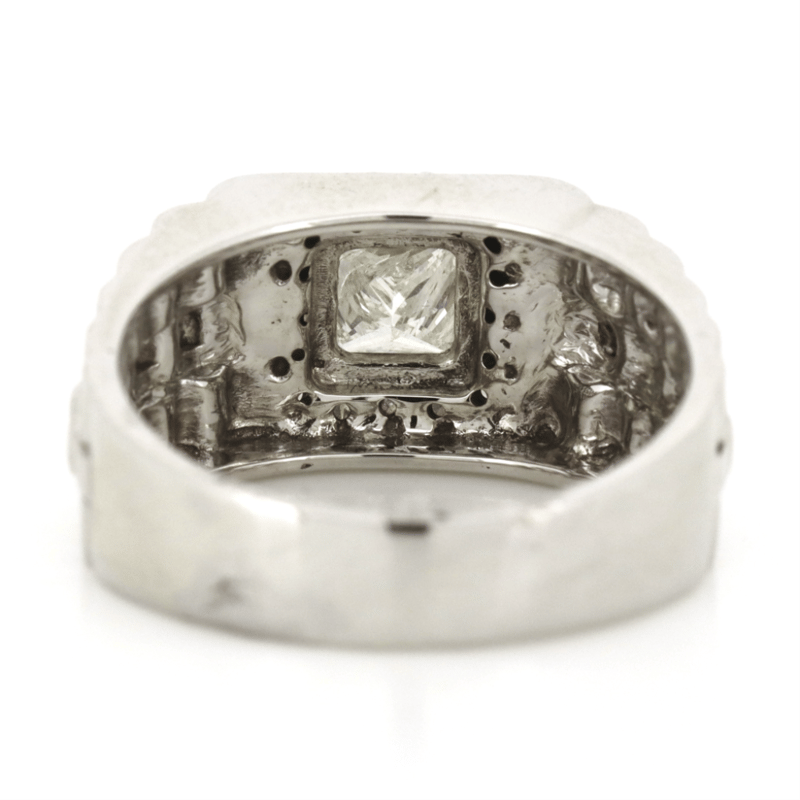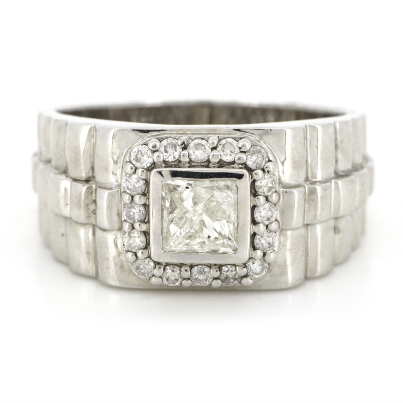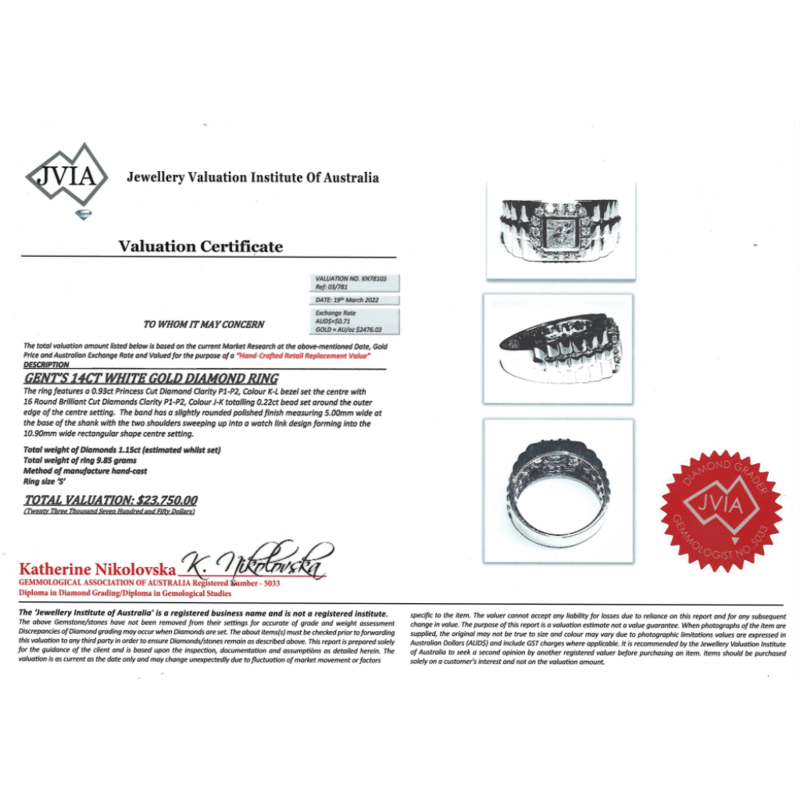 14K WHITE GOLD AND DIAMOND, GENTS RING. The Centre Features, One Princess Cut, Diamond (0.93Ct, K-L Colour, P1-P2 Clarity), Bezel Set. Surrounding The Centre In A Halo Are, 16 Round Brilliant Cut, Diamonds (0.22Ct Tdw, J-K Colour, P1-P2 Clarity), Bead Set. Ring Size S. Valuations Provided by an Independent Third-Party Professional Not Directly Associated With Lloyds Auctions at AUD $$23,750.00This valuation has been conducted by an independent third-party professional. The valuation amount is an assessment by the issuing valuer and does not reflect the auction value of the item. Any inquiries regarding the valuation should be directed to the issuing valuer (refer to contact details on the certificate), as Lloyds Auctions has no affiliation or influence over the valuation, the valuer, or the stated amount. Condition: Good - Refer Images 0+1426