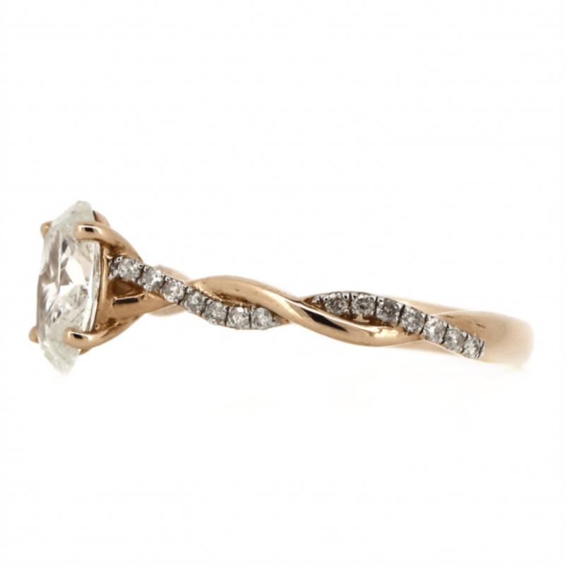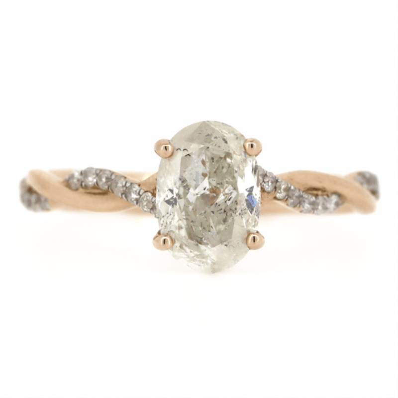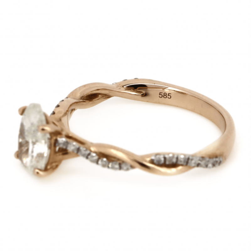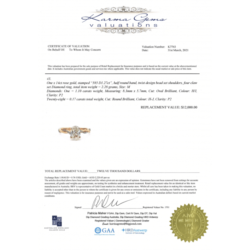 14K ROSE GOLD AND DIAMOND, TWIST BAND RING. The Centre Features, One Oval Brilliant Cut, Diamond (1.10Ct, H-I Colour, P2 Clarity), 4 Claw Set. Decorating The Twist Band Are, 28 Round Brilliant Cut, Diamonds (0.17Ct Tdw, H-J Colour, P2 Clarity), Bead Set. Ring Size M. Valuations Provided by an Independent Third-Party Professional Not Directly Associated With Lloyds Auctions at AUD $$12,000.00This valuation has been conducted by an independent third-party professional. The valuation amount is an assessment by the issuing valuer and does not reflect the auction value of the item. Any inquiries regarding the valuation should be directed to the issuing valuer (refer to contact details on the certificate), as Lloyds Auctions has no affiliation or influence over the valuation, the valuer, or the stated amount. Condition: Good - Refer Images 0+1401