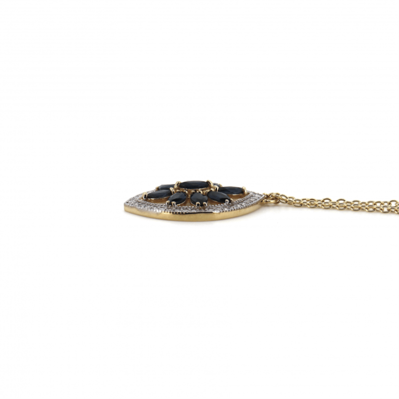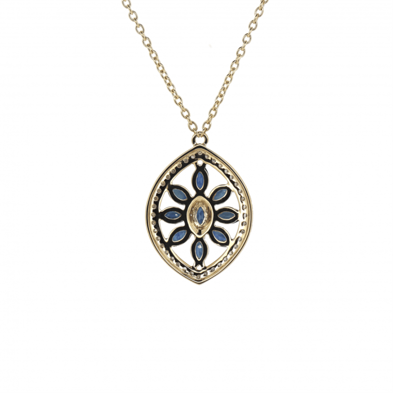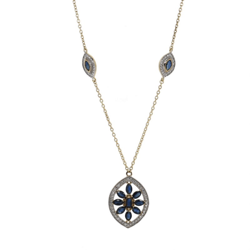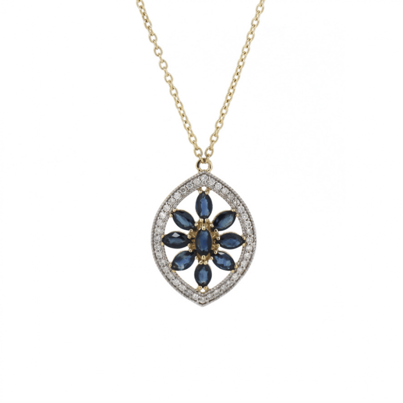 14K YELLOW/WHITE GOLD, BLUE SAPPHIRE AND DIAMOND, NECKLACE. The Design Features, 15 Marquise Cut, Medium Blue, Sapphires (2.94Ct Tsw, Minor Eye Visible Inclusions), Claw Set. Decorating The Design, Are 160 Round Brilliant Cut, Diamonds (0.91Ct Tdw, J-K Colour, Si2-I2 Clarity), Bead Set In White Gold With Millegrain Detail. The Necklace Has A Lobster Claw Clasp. Necklace Length Is 56.6Cm. Valuations Provided by an Independent Third-Party Professional Not Directly Associated With Lloyds Auctions at AUD $$9,290.00This valuation has been conducted by an independent third-party professional. The valuation amount is an assessment by the issuing valuer and does not reflect the auction value of the item. Any inquiries regarding the valuation should be directed to the issuing valuer (refer to contact details on the certificate), as Lloyds Auctions has no affiliation or influence over the valuation, the valuer, or the stated amount. Condition: Good - Refer Images 0+1452