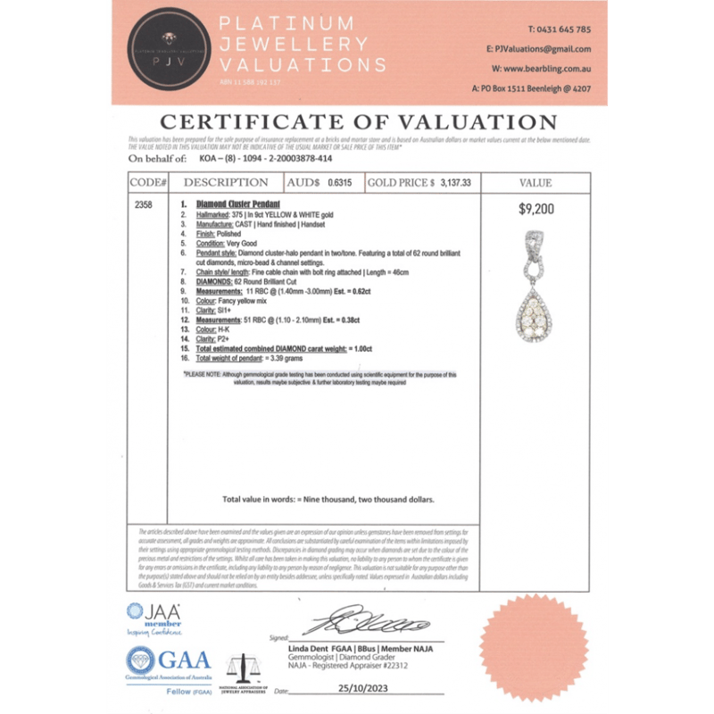 9K YELLOW/WHITE GOLD, FANCY YELLOW DIAMOND AND DIAMOND, NECKLACE. The Pendant Features, 11 Round Brilliant, Fancy Yellow Mix, Diamonds (0.62Ct Tdw, Si1+ Clarity), Micro Bead Set. Encompassing The Centre Are, 51 Round Brilliant Cut, Diamonds (0.38Ct Tdw, H-K Colour, P2+ Clarity), Channel Set. Chain Length 46Cm. Condition: Pre-Owned. Valuations Provided by an Independent Third-Party Professional Not Directly Associated With Lloyds Auctions at AUD $$9,200.00This valuation has been conducted by an independent third-party professional. The valuation amount is an assessment by the issuing valuer and does not reflect the auction value of the item. Any inquiries regarding the valuation should be directed to the issuing valuer (refer to contact details on the certificate), as Lloyds Auctions has no affiliation or influence over the valuation, the valuer, or the stated amount. Condition: Good - Refer Images 0+1402