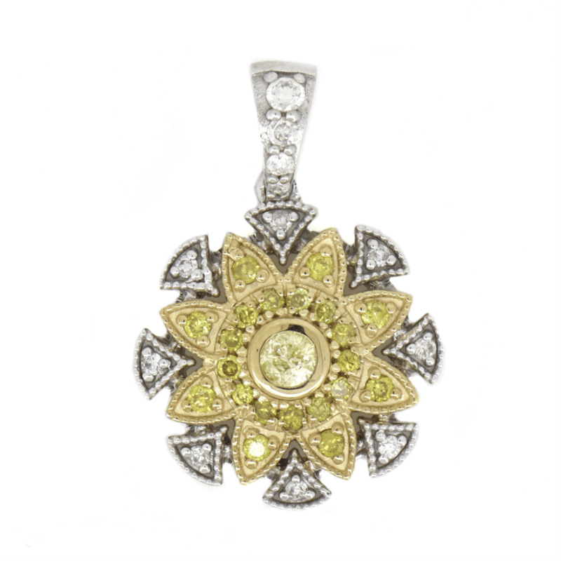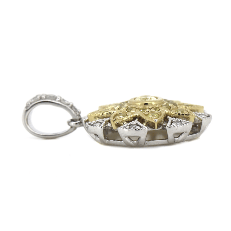 14K WHITE/YELLOW GOLD, FANCY YELLOW DIAMOND AND DIAMOND, DECORATIVE DROP PENDANT. The Centre Features, One Round Brilliant Cut, Fancy Yellow, Diamond (0.08Ct, I1 Clarity), Bezel Set. Encompassing The Design Are, 21 Round Brilliant Cut, Fancy Yellow Diamonds (0.20Ct Tdw, Si Clarity), Claw And Bead Set. Decorating The Outer Design Are, 12 Round Brilliant Cut, Diamonds (0.11Ct Tdw, G-J Colour, Si-I2 Clarity), Bead Set. Valuations Provided by an Independent Third-Party Professional Not Directly Associated With Lloyds Auctions at AUD $$7,400.00This valuation has been conducted by an independent third-party professional. The valuation amount is an assessment by the issuing valuer and does not reflect the auction value of the item. Any inquiries regarding the valuation should be directed to the issuing valuer (refer to contact details on the certificate), as Lloyds Auctions has no affiliation or influence over the valuation, the valuer, or the stated amount. Condition: Good - Refer Images 0+1466