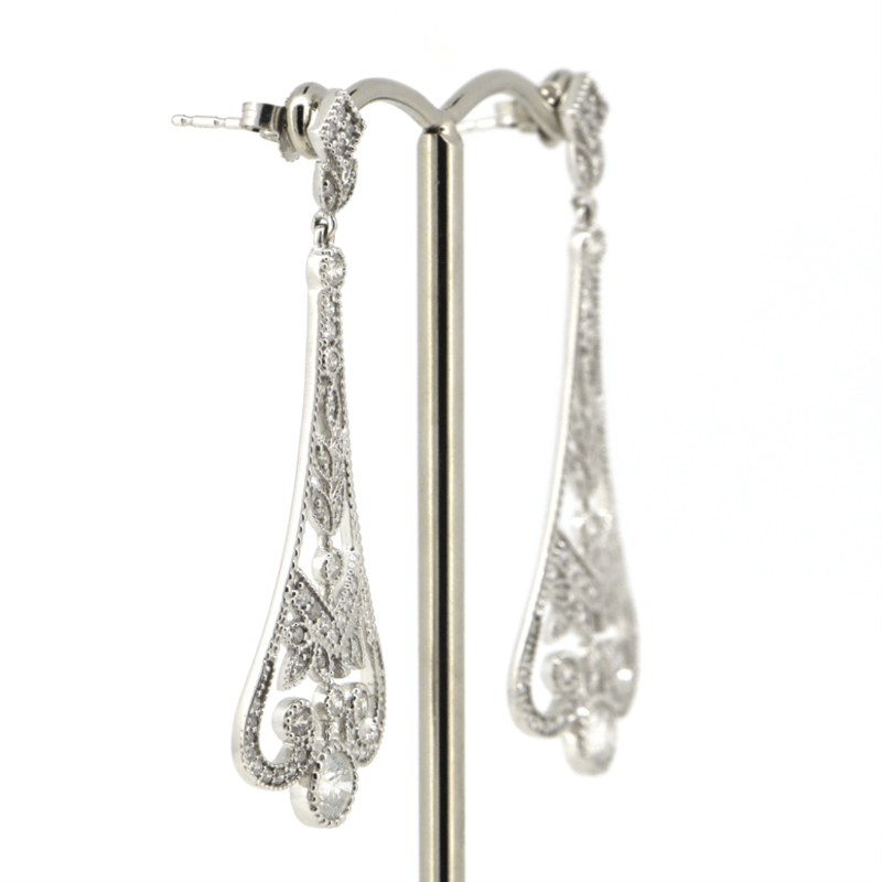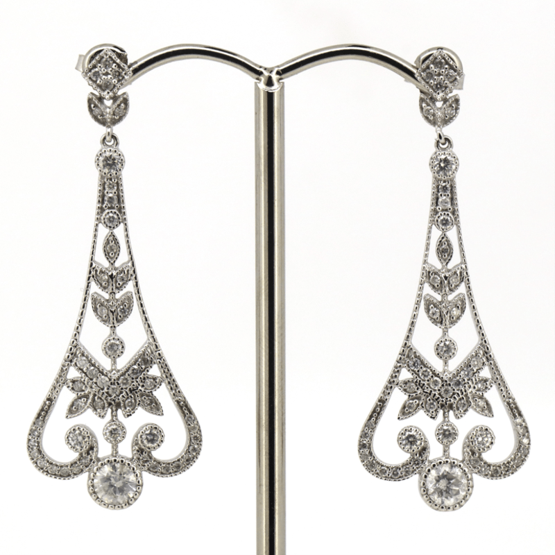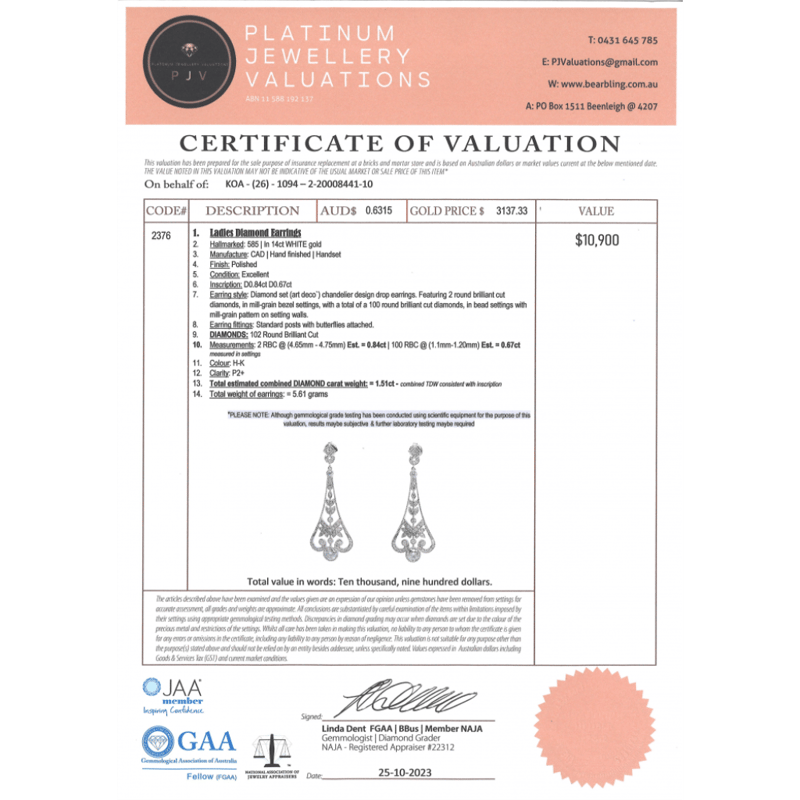 14K WHITE GOLD AND DIAMOND, DROP EARRINGS. The Design Features, 2 Round Brilliant Cut, Diamonds (0.84Ct Tdw, H-K Colour, P2 Clarity), Bezel Set With Millegrain Detail. Decorating The Design Are, 100 Round Brilliant Cut, Diamonds (0.67Ct Tdw, H-K Colour, P2+ Clarity), Bead Set With Millegrain Detail. The Earrings Have Post Backs With 14K White Gold Butterfly Clasps. Valuations Provided by an Independent Third-Party Professional Not Directly Associated With Lloyds Auctions at AUD $$10,900.00This valuation has been conducted by an independent third-party professional. The valuation amount is an assessment by the issuing valuer and does not reflect the auction value of the item. Any inquiries regarding the valuation should be directed to the issuing valuer (refer to contact details on the certificate), as Lloyds Auctions has no affiliation or influence over the valuation, the valuer, or the stated amount. Condition: Good - Refer Images 0+1418