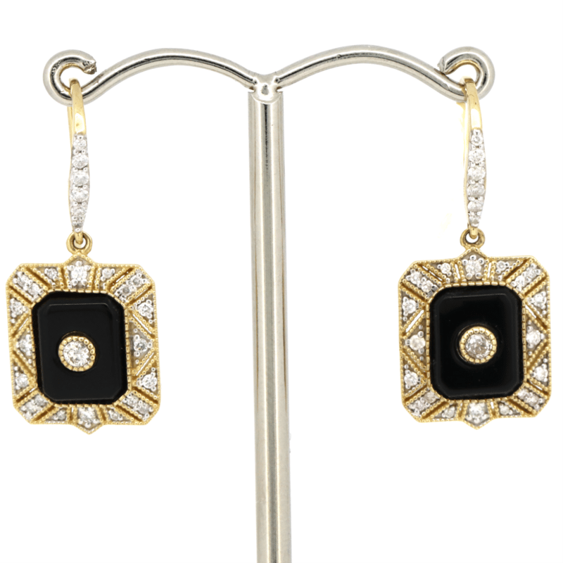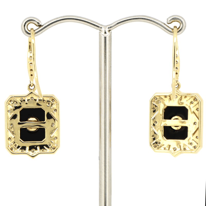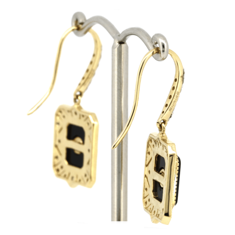 14K YELLOW GOLD, ONYX AND DIAMOND, EARRINGS. The Earrings Feature, 2 Rectangle Cut, Black, Onyx (2.78Ct Tsw, Opaque), Bezel Set. Centering The Onyx And Decorating The Hooks Are, 2 Old Mine And 52 Round Brilliant Cut, Diamonds (0.45Ct Tdw, H-J Colour, Si1-P2 Clarity), Bead Set. The Earrings Feature Shepherd Hooks. Valuations Provided by an Independent Third-Party Professional Not Directly Associated With Lloyds Auctions at AUD $$13,600.00This valuation has been conducted by an independent third-party professional. The valuation amount is an assessment by the issuing valuer and does not reflect the auction value of the item. Any inquiries regarding the valuation should be directed to the issuing valuer (refer to contact details on the certificate), as Lloyds Auctions has no affiliation or influence over the valuation, the valuer, or the stated amount. Condition: Good - Refer Images 0+1411