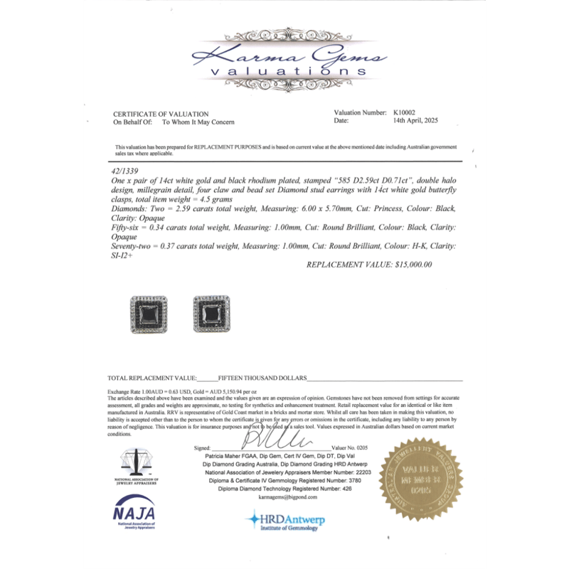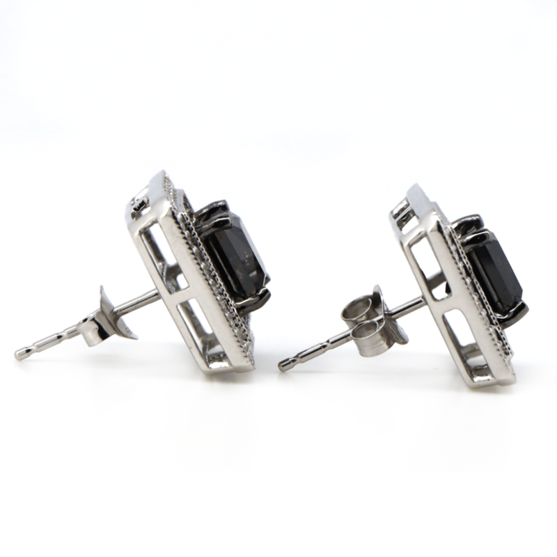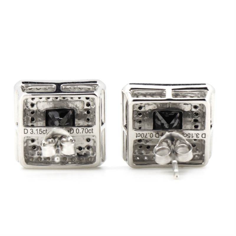 The Centres Feature, 2 Princess Cut, Black, Diamonds (2.59Ct Tdw, Opaque), 4 Claw Set. Surrounding The Centre In The Innermost Halo Are, 56 Round Brilliant Cut, Black, Diamonds (0.34Ct Tdw, Opaque), Bead Set. Surrounding The Centre In The Outermost Halo Are, 72 Round Brilliant Cut, Diamonds (0.37Ct Tdw, H-K Colour, Si-I2+ Clarity), Bead Set. The Earrings Feature Butterfly Clasps.
