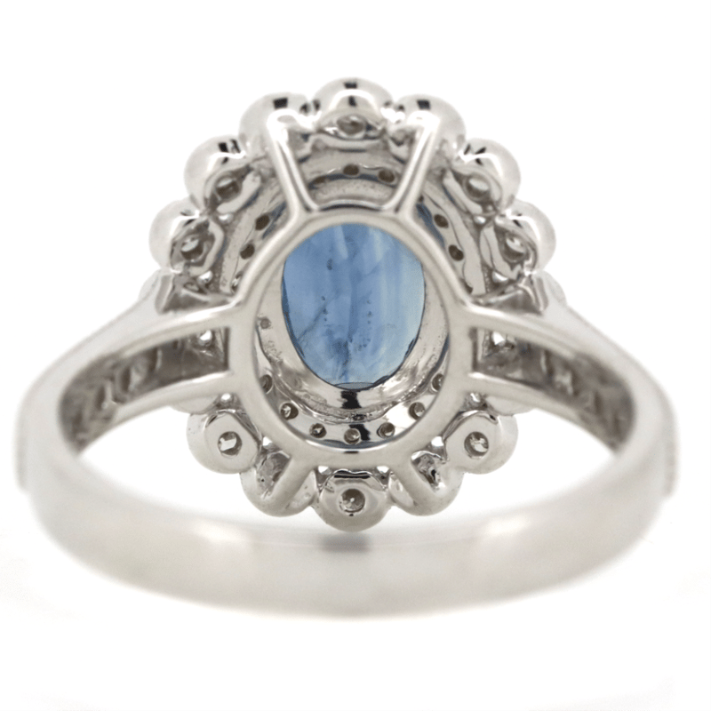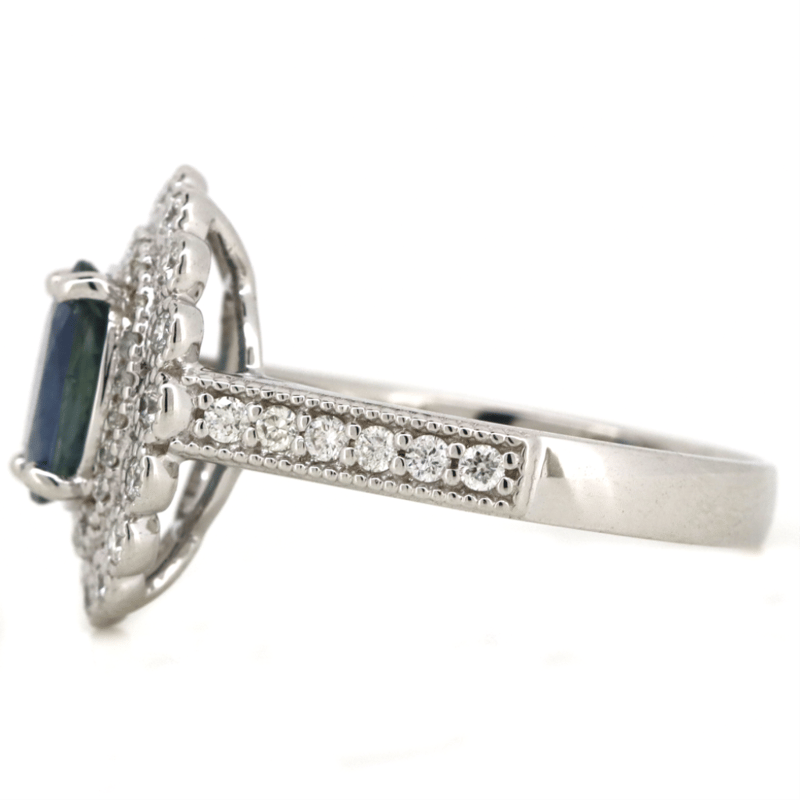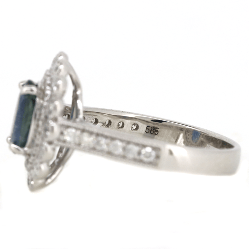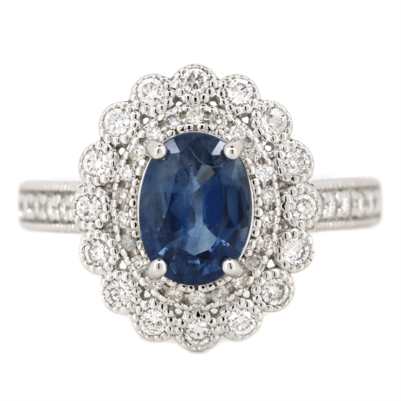 14K WHITE GOLD, 1.41CT BLUE CEYLON SAPPHIRE AND DIAMOND, HALO RING. The Design Features, One Oval Cut, Deep Moderate Blue, Ceylon Sapphire (1.41Ct, Slightly Included), 4 Claw Set. Surrounding The Design Are, 50 Round Brilliant Cut, Diamonds (0.46Ct Tdw, G-H Colour, Si1-Si2 Clarity), Bezel/Micro-Claw/Bead Set With Millegrain Detail. Ring Size M 1/2. Valuations Provided by an Independent Third-Party Professional Not Directly Associated With Lloyds Auctions at AUD $$17,000.00This valuation has been conducted by an independent third-party professional. The valuation amount is an assessment by the issuing valuer and does not reflect the auction value of the item. Any inquiries regarding the valuation should be directed to the issuing valuer (refer to contact details on the certificate), as Lloyds Auctions has no affiliation or influence over the valuation, the valuer, or the stated amount. Condition: Good - Refer Images 0645925+205