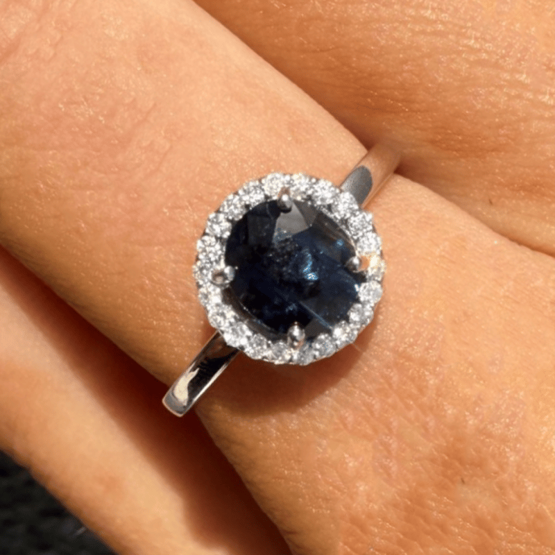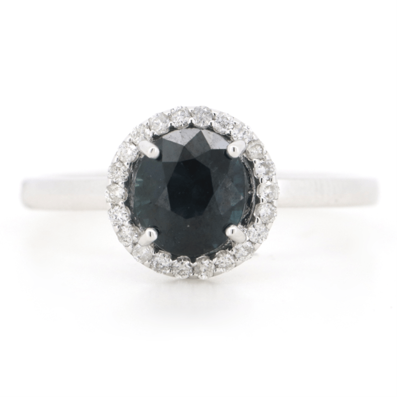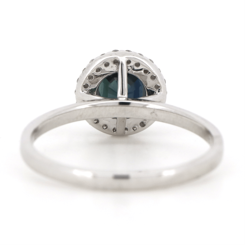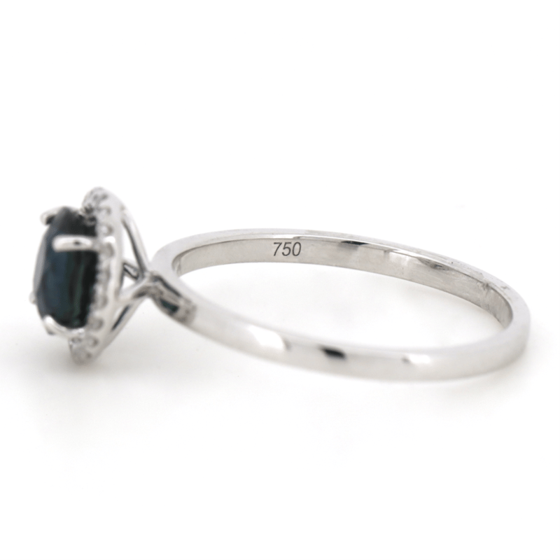 18K WHITE GOLD, BLUE/GREEN SAPPHIRE AND DIAMOND, HALO RING. The Centre Features, One Dark Greenish-Blue, Sapphire (1.51Ct, Eye Clean Clarity), 4 Claw Set. Surrounding The Centre In A Halo Are, 22 Round Brilliant Cut, Diamonds (0.13Ct Tdw, H-I Colour, Si-I2+ Clarity), Cutaway Claw Set. Ring Size N. Valuations Provided by an Independent Third-Party Professional Not Directly Associated With Lloyds Auctions at AUD $$15,450.00This valuation has been conducted by an independent third-party professional. The valuation amount is an assessment by the issuing valuer and does not reflect the auction value of the item. Any inquiries regarding the valuation should be directed to the issuing valuer (refer to contact details on the certificate), as Lloyds Auctions has no affiliation or influence over the valuation, the valuer, or the stated amount. Condition: Good - Refer Images 0645925+206