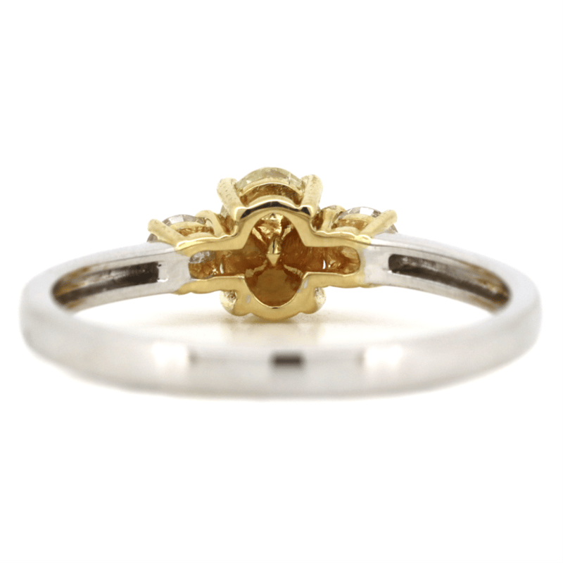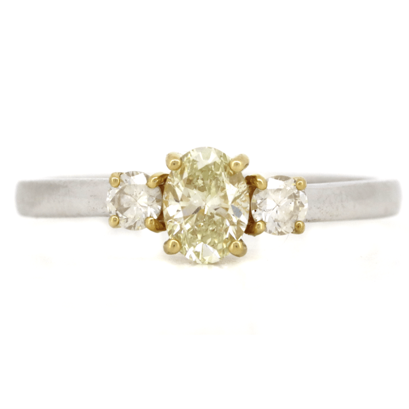 14K YELLOW/WHITE GOLD, FANCY YELLOW DIAMOND AND DIAMOND, TRILOGY RING. The Centre Features, One Oval Faceted Cut, Fancy Light Yellow Diamond (0.46Ct Tdw, Si1 Clarity), Claw Set. Flanking The Centre Are, 2 Round Brilliant Cut, Diamonds (0.20Ct Tdw, H-I Colour, Si1 Clarity), Claw Set. Ring Size M 1/2. Valuations Provided by an Independent Third-Party Professional Not Directly Associated With Lloyds Auctions at AUD $$13,700.00This valuation has been conducted by an independent third-party professional. The valuation amount is an assessment by the issuing valuer and does not reflect the auction value of the item. Any inquiries regarding the valuation should be directed to the issuing valuer (refer to contact details on the certificate), as Lloyds Auctions has no affiliation or influence over the valuation, the valuer, or the stated amount. Condition: Good - Refer Images 0645925+212