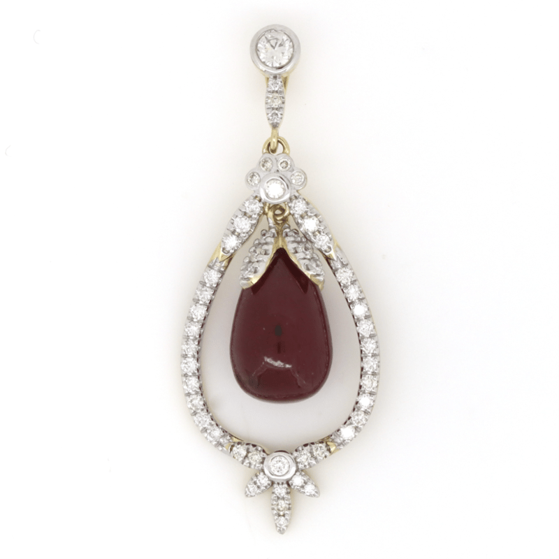 The Pendant Features, One Drop/Cabochon Cut, Deep Moderate Red, Ruby (8.38Ct, Moderate Inclusions), Multi Claw Set. Embellishing The Design Are, 59 Round Brilliant Cut, Diamonds (0.66Ct Tdw, G-H Colour, Si1-Si2 Clarity), Bezel/Pip Set.