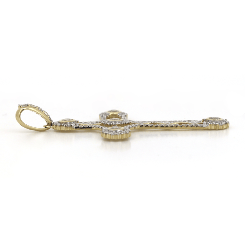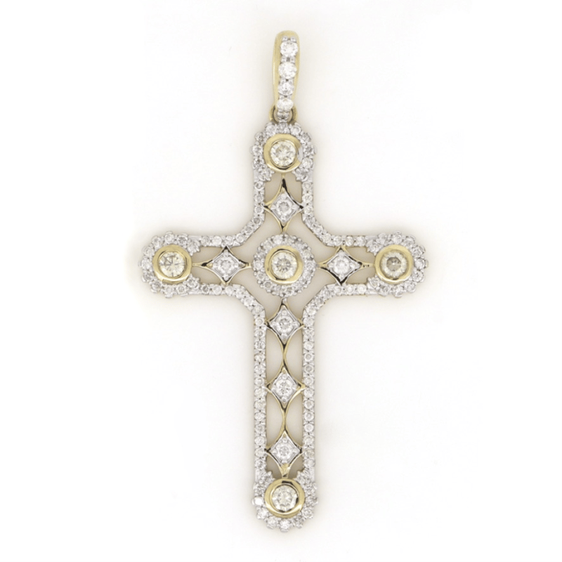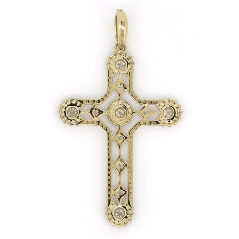 14K YELLOW GOLD AND DIAMOND, DECORATIVE CRUCIFIX PENDANT. The Design Features, 5 Round Brilliant Cut, Diamonds (0.46Ct Tdw, K-M Colour, Si1-2 Clarity), Bezel Set. Bordering The Design Are, 125 Round Brilliant Cut, Diamonds (0.92Ct Tdw, H-J Colour, Si-I2 Clarity), Claw Set. Valuations Provided by an Independent Third-Party Professional Not Directly Associated With Lloyds Auctions at AUD $$18,300.00This valuation has been conducted by an independent third-party professional. The valuation amount is an assessment by the issuing valuer and does not reflect the auction value of the item. Any inquiries regarding the valuation should be directed to the issuing valuer (refer to contact details on the certificate), as Lloyds Auctions has no affiliation or influence over the valuation, the valuer, or the stated amount. Condition: Good - Refer Images 0645925+216
