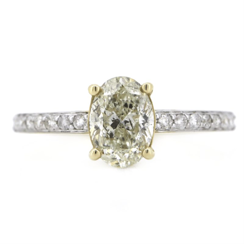 14K YELLOW GOLD AND DIAMOND, CLASSIC RING. The Centre Features, One Oval Cut, Diamond (1.01Ct, L Colour, Si2 Clarity), 4 Claw Set. Decorating The Band Are, 16 Round Brilliant Cut, Diamonds (0.15Ct Tdw, J-K Colour, Si1-I1 Clarity), Bead Set In White Gold. Ring Size K 1/2. Valuations Provided by an Independent Third-Party Professional Not Directly Associated With Lloyds Auctions at AUD $$11,490.00This valuation has been conducted by an independent third-party professional. The valuation amount is an assessment by the issuing valuer and does not reflect the auction value of the item. Any inquiries regarding the valuation should be directed to the issuing valuer (refer to contact details on the certificate), as Lloyds Auctions has no affiliation or influence over the valuation, the valuer, or the stated amount. Condition: Good - Refer Images 0645925+217