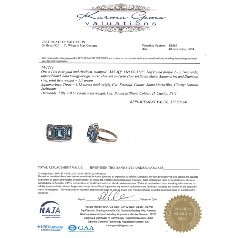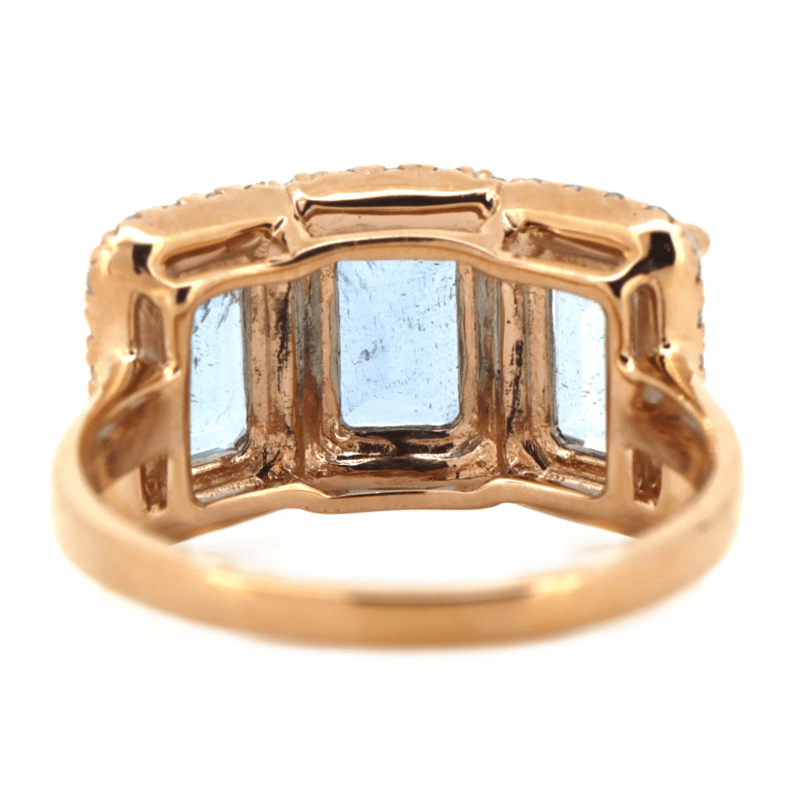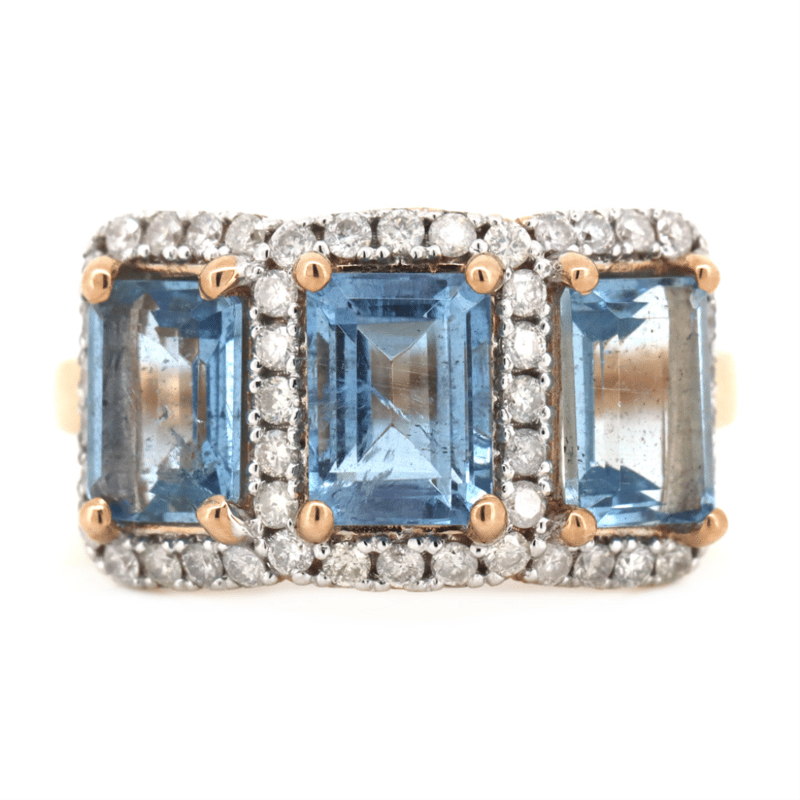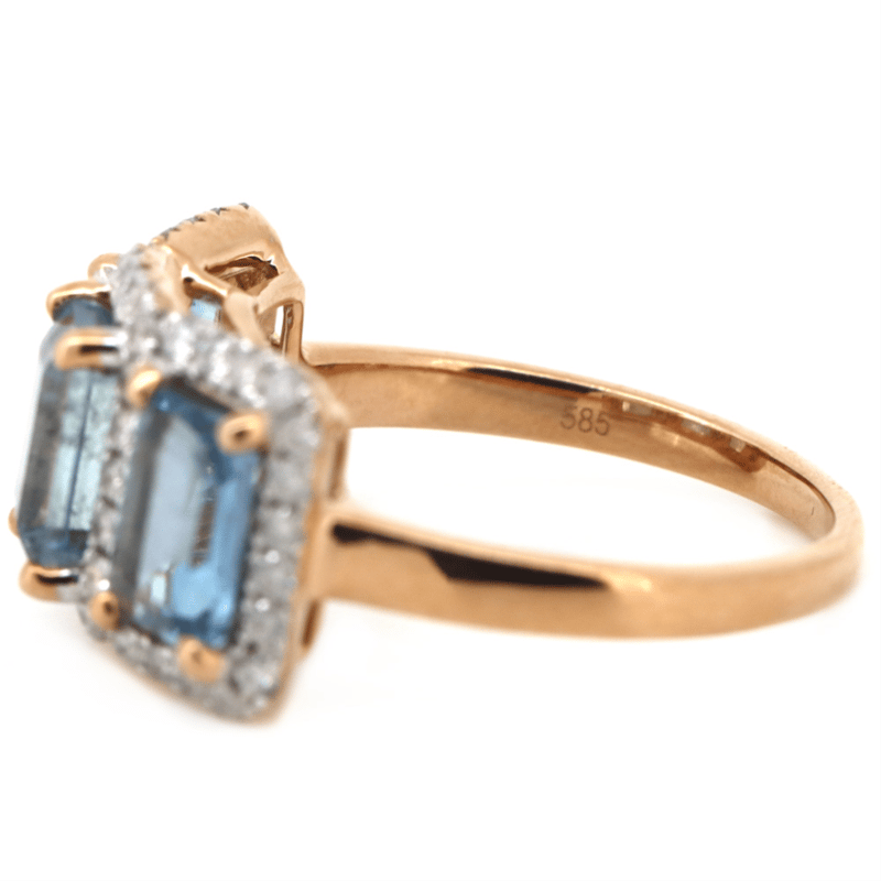 14K ROSE GOLD, AQUAMARINE AND DIAMOND, HALO TRILOGY RING.