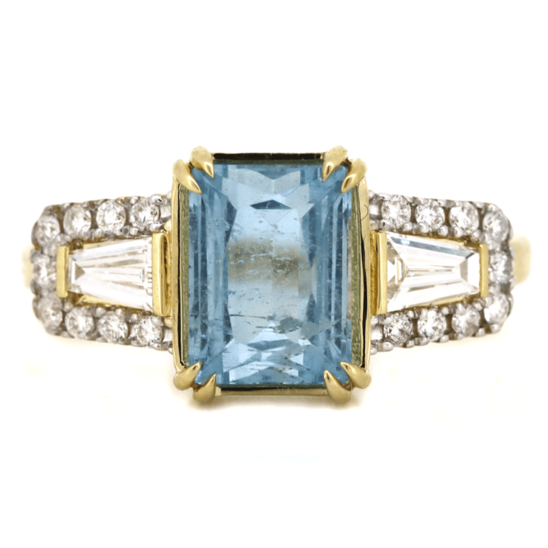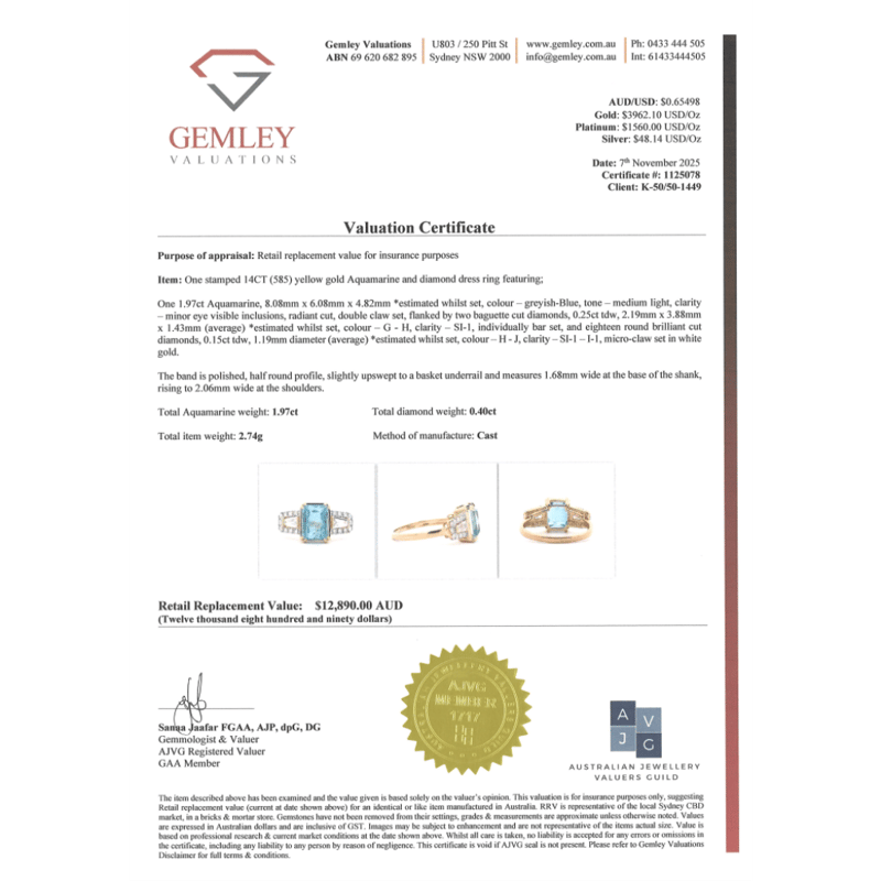 14K YELLOW GOLD, AQUAMARINE AND DIAMOND, DRESS RING. The Centre Features, One Radiant Cut, Aquamarine (1.97Ct, Minor Eye Visible Inclusions), Double Claw Set. Flanking The Centre Are, 2 Baguette Cut, Diamonds (0.25Ct Tdw, G-H Colour, Si1 Clarity) Bar Set. Encompassing The Diamonds Are, 18 Round Brilliant Cut, Diamonds (0.15Ct Tdw, H-J Colour, Si1-I1 Clarity), Bead Set. Ring Size M. Valuations Provided by an Independent Third-Party Professional Not Directly Associated With Lloyds Auctions at AUD $$12,890.00This valuation has been conducted by an independent third-party professional. The valuation amount is an assessment by the issuing valuer and does not reflect the auction value of the item. Any inquiries regarding the valuation should be directed to the issuing valuer (refer to contact details on the certificate), as Lloyds Auctions has no affiliation or influence over the valuation, the valuer, or the stated amount. Condition: Good - Refer Images 0645925+222