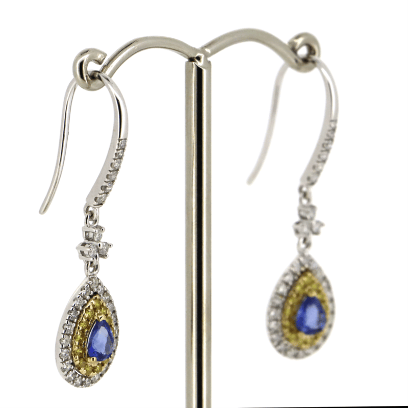 14K WHITE/YELLOW GOLD, 0.72CT TSW CEYLON SAPPHIRE AND DIAMOND, HALO DROP EARRINGS. The Central Design Features, 2 Pear Modified Brilliant Cut, Ceylon Sapphires (0.72Ct Tsw, Very Light Natural Inclusions), Claw Set. Surrounding The Centres In The Inner Halos Are, 26 Round Brilliant Cut, Fancy Yellow Diamonds (0.27Ct Tdw, Si Clarity), Micro-Bead Set. Decorating The Outer Halos And Hooks Are, 58 Round Brilliant Cut, Diamonds (0.60Ct Tdw, G-J Colour, Si-I2+ Clarity), Micro-Bead Set. Earrings Have Shepherd Hooks. Valuations Provided by an Independent Third-Party Professional Not Directly Associated With Lloyds Auctions at AUD $$17,100.00This valuation has been conducted by an independent third-party professional. The valuation amount is an assessment by the issuing valuer and does not reflect the auction value of the item. Any inquiries regarding the valuation should be directed to the issuing valuer (refer to contact details on the certificate), as Lloyds Auctions has no affiliation or influence over the valuation, the valuer, or the stated amount. Condition: Good - Refer Images 0645925+224