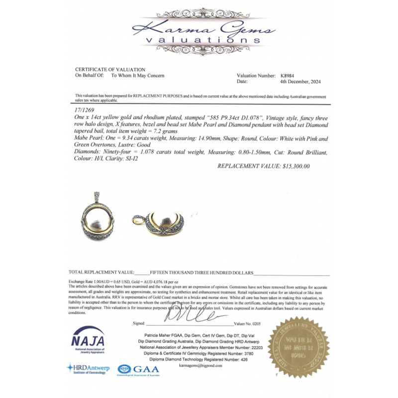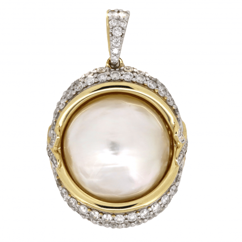 14K YELLOW GOLD, WHITE CULTURED MABE PEARL AND DIAMOND, VINTAGE INSPIRED PENDANT.