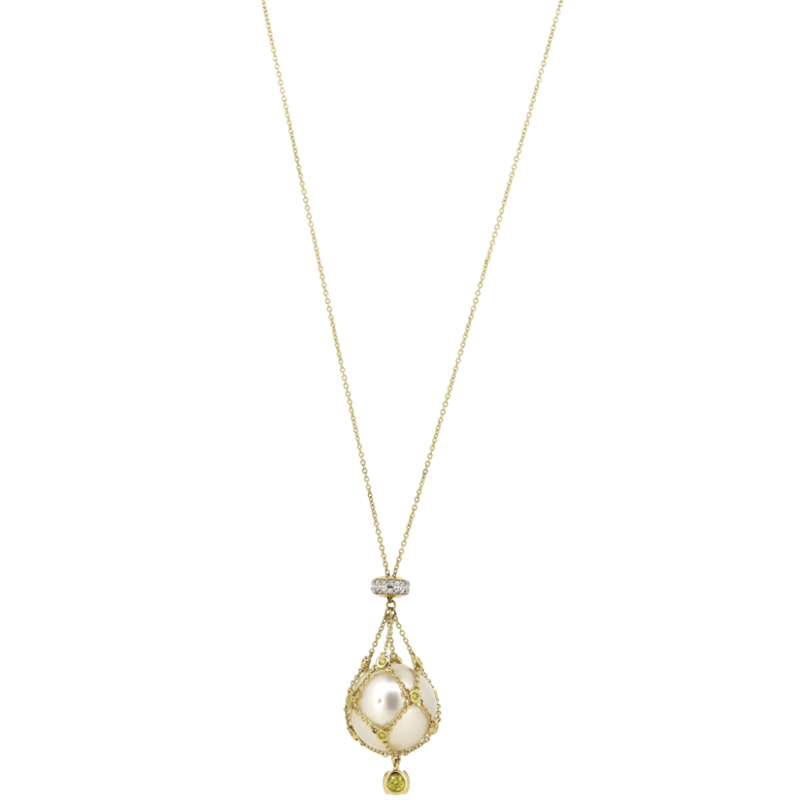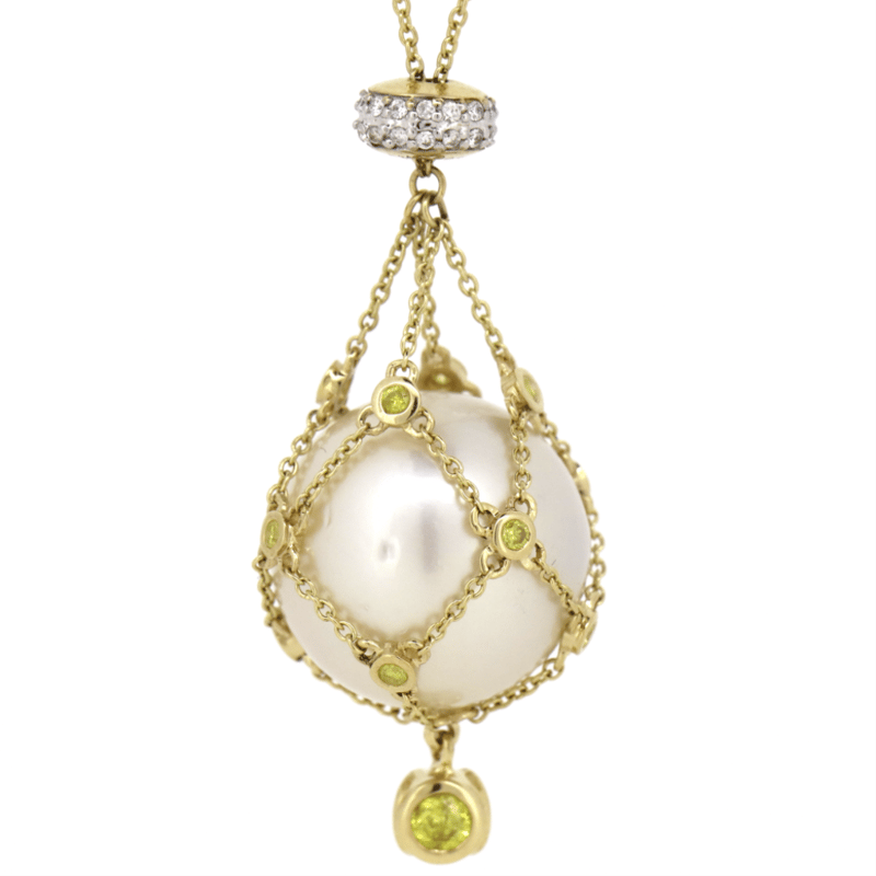 The Design Features One Round, White With Silver Overtones, South Sea Pearl (25.34Ct/16.20Mm Size, Medium Lustre, Surface Growth Marks), Unset In A "Cage" Chain. The Chain Features, 15 Round Brilliant Cut, Fancy Yellow Diamonds (0.41Ct Tdw, Si-2 Clarity, Treated) And 28 Round Brilliant Cut, Diamonds (0.10Ct Tdw, H-J Colour, Si-I2 Clarity), Bezel/Bead Set. The Necklace Features A Lobster Claw Clasp Closure. Necklace Length Is 45Cm.