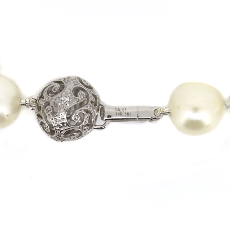 The Design Features, 3 Near Round, Black With Grey, Purple And Green Overtones, Tahitian Pearls (15.50Mm-15.78Mm, Medium Lustre, Slightly Blemished) And 34 White Cultured South Sea Pearls, With Silver And Gold Overtones (9.75Mm - 11.85Mm Size, Medium Lustre, Medium Blemishes), Strung In A Single Row, Graduating In Size. Embellishing The 14K White Gold Filigree Ball Clasp Are, 4 Round Brilliant Cut, Diamonds (0.05Ct Tdw, H-J Colour, Si1-I1 Clarity), Bead Set. Necklace Length Is 50Cm.