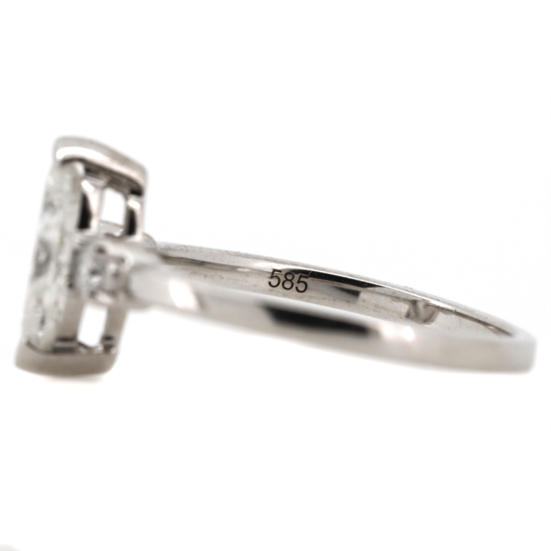 14K WHITE GOLD AND DIAMOND, TRILOGY RING. The Centre Features, One Marquise Brilliant Cut, Diamond (1.02Ct, H-I Colour, I2 Clarity), Claw Set. Flanked On Either Side Are, 2 Round Brilliant Cut, Diamonds (0.13Ct Tdw, H-J Colour, Si1 Clarity), Claw Set. Ring Size L. Valuations Provided by an Independent Third-Party Professional Not Directly Associated With Lloyds Auctions at AUD $$17,400.00This valuation has been conducted by an independent third-party professional. The valuation amount is an assessment by the issuing valuer and does not reflect the auction value of the item. Any inquiries regarding the valuation should be directed to the issuing valuer (refer to contact details on the certificate), as Lloyds Auctions has no affiliation or influence over the valuation, the valuer, or the stated amount. Condition: Good - Refer Images 0645925+231