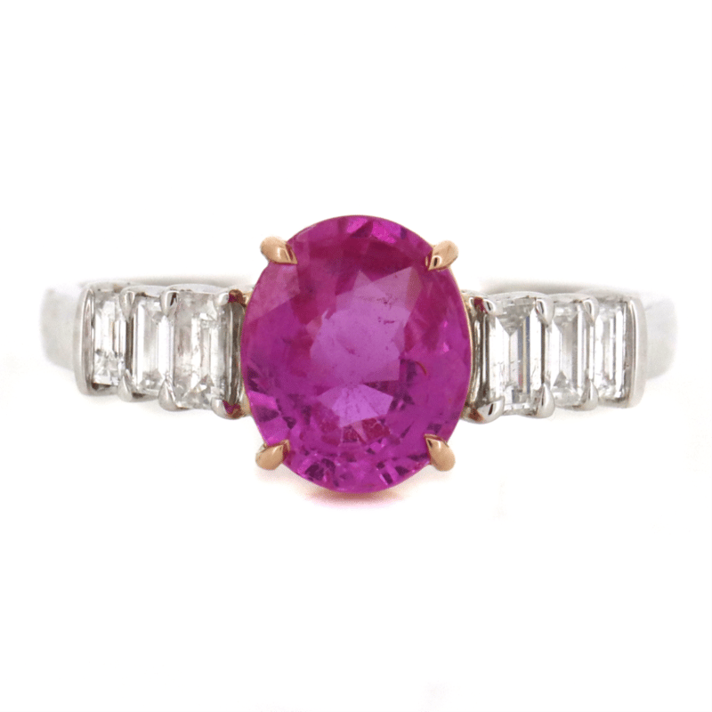 14K WHITE/ROSE GOLD, PINK SAPPHIRE AND DIAMOND, DRESS RING. The Centre Features, One Oval Mixed Cut, Strong Pink Sapphire (20.3Ct, Light Natural Inclusions), Claw Set In 14K Rose Gold. Encompassing The Centre And Decorating The Band Are, 6 Baguette Cut, Diamonds (0.37Ct Tdw, G-H Colour, Si-I2 Clarity), Claw Set. Ring Size N. Valuations Provided by an Independent Third-Party Professional Not Directly Associated With Lloyds Auctions at AUD $$16,900.00This valuation has been conducted by an independent third-party professional. The valuation amount is an assessment by the issuing valuer and does not reflect the auction value of the item. Any inquiries regarding the valuation should be directed to the issuing valuer (refer to contact details on the certificate), as Lloyds Auctions has no affiliation or influence over the valuation, the valuer, or the stated amount. Condition: Good - Refer Images 0645925+234