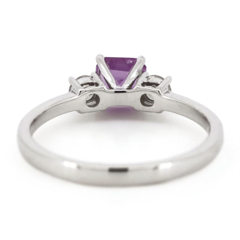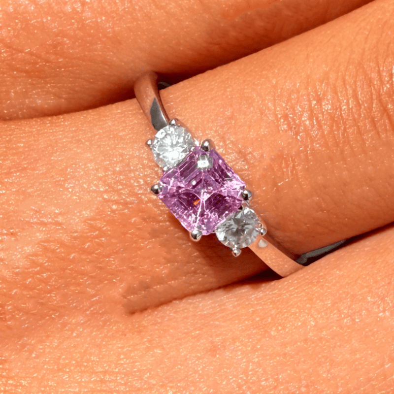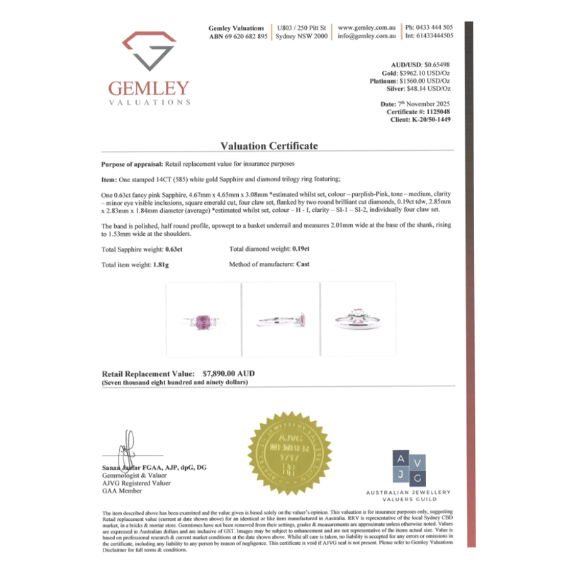 14K WHITE GOLD, PINK SAPPHIRE AND DIAMOND, TRILOGY RING. The Centre Features, One Square Cut, Pink Sapphire (0.63Ct, Minor Eye Visible Inclusions), Claw Set. Flanking Either Side Of The Centre Are, 2 Round Brilliant Cut, Diamonds (0.19Ct Tdw, H-I Colour, Si1-Si2 Clarity), Claw Set. Ring Size M. Valuations Provided by an Independent Third-Party Professional Not Directly Associated With Lloyds Auctions at AUD $$7,890.00This valuation has been conducted by an independent third-party professional. The valuation amount is an assessment by the issuing valuer and does not reflect the auction value of the item. Any inquiries regarding the valuation should be directed to the issuing valuer (refer to contact details on the certificate), as Lloyds Auctions has no affiliation or influence over the valuation, the valuer, or the stated amount. Condition: Good - Refer Images 0645925+235