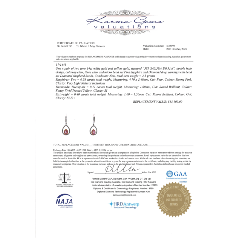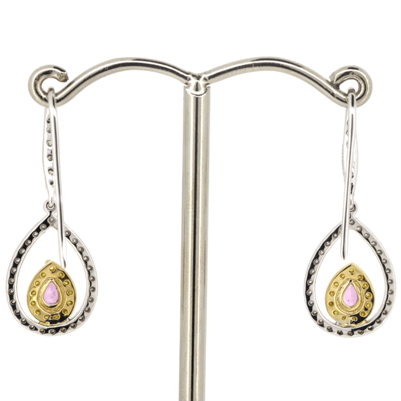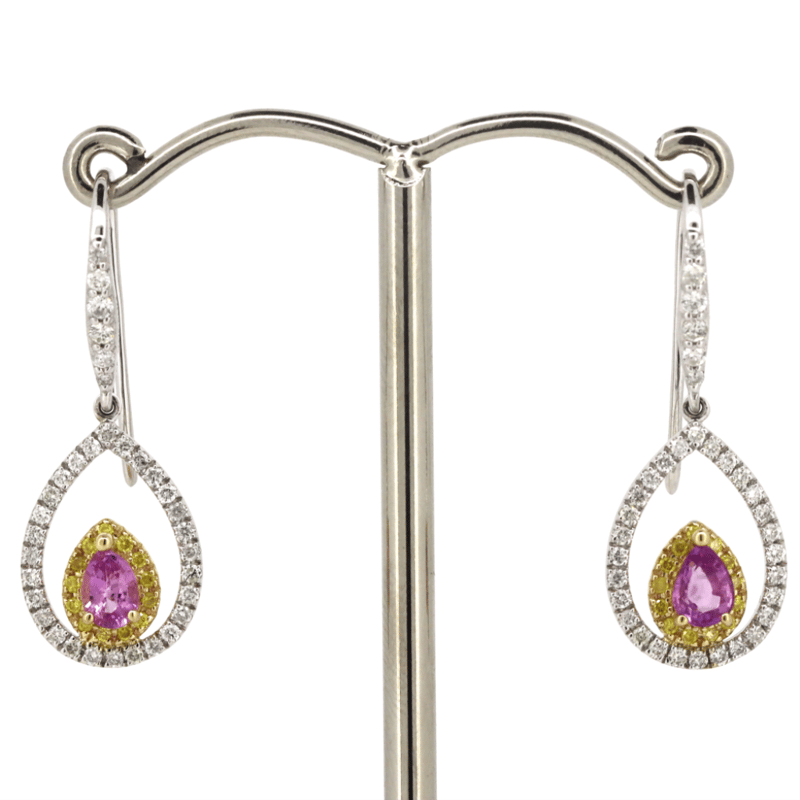 The Central Design Features, 2 Pear Cut, Pink Sapphires (0.58Ct, Very Light Natural Inclusions), Claw Set. Decorating The Innermost Halos Are 26 Round Brilliant Cut, Fancy Yellow Diamonds (0.11Ct Tdw, Si Clarity, Treated), Micro-Bead Set. Decorating The Outer Halos And Hooks Are, 68 Round Brilliant Cut, Diamonds (0.40Ct Tdw, G-J Colour, Si-I2+ Clarity), Micro-Bead Set. The Earrings Have Shepherd Hooks.