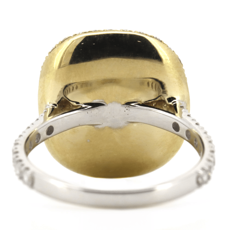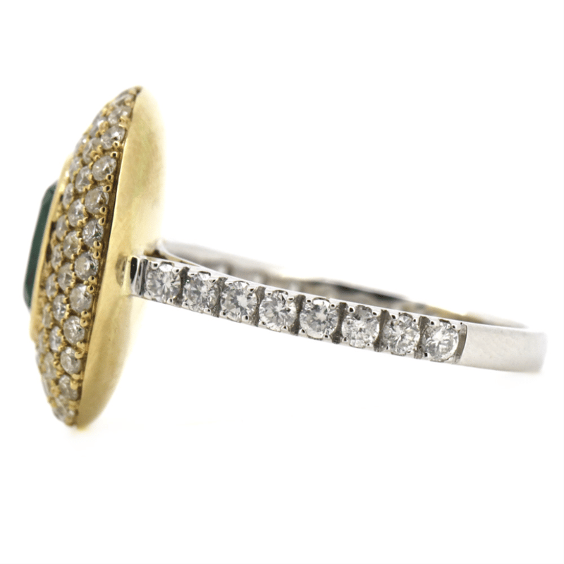 14K WHITE/YELLOW GOLD, EMERALD AND DIAMOND, HALO COCKTAIL RING. The Centre Design Features, One Cushion Cut, Dark Blue/Green, Emerald (1.65Ct, Slightly Included), Bezel Set In Yellow Gold. Encompassing The Design Are, 100 Round Brilliant Cut, Diamonds (1.08Ct Tdw, G-H Colour, Si1-Si2 Clarity), Micro-Claw Set In White/Yellow Gold. Ring Size M 1/2. Valuations Provided by an Independent Third-Party Professional Not Directly Associated With Lloyds Auctions at AUD $$27,000.00This valuation has been conducted by an independent third-party professional. The valuation amount is an assessment by the issuing valuer and does not reflect the auction value of the item. Any inquiries regarding the valuation should be directed to the issuing valuer (refer to contact details on the certificate), as Lloyds Auctions has no affiliation or influence over the valuation, the valuer, or the stated amount. Condition: Good - Refer Images 0645925+242