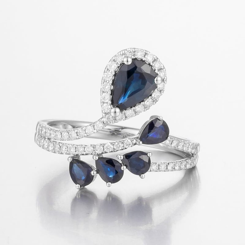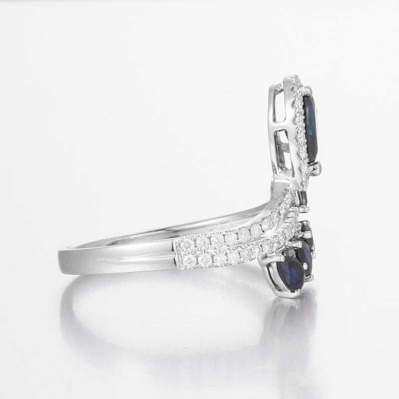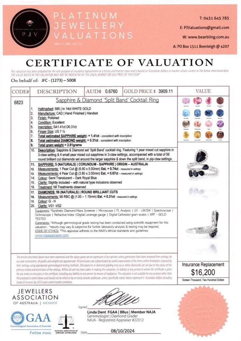 14CT WHITE GOLD AUSTRALIAN SAPPHIRE AND DIAMOND DRESS RING Featuring Centre, 5 Pear Cut, Dark Royal Blue Australian Sapphires (1.41Ct Tsw, Slightly Included), Claw Set, With 56 Round Brilliant Cut Diamonds (0.31Ct Tdw, G-H Colour, Vs1-Vs2 Clarity), Pip Claw Set. Ring Size O. Valuations Provided by an Independent Third-Party Professional Not Directly Associated With Lloyds Auctions at AUD $16200This valuation has been conducted by an independent third-party professional. The valuation amount is an assessment by the issuing valuer and does not reflect the auction value of the item. Any inquiries regarding the valuation should be directed to the issuing valuer (refer to contact details on the certificate), as Lloyds Auctions has no affiliation or influence over the valuation, the valuer, or the stated amount. Condition: Good - Refer Images 0586382+1800