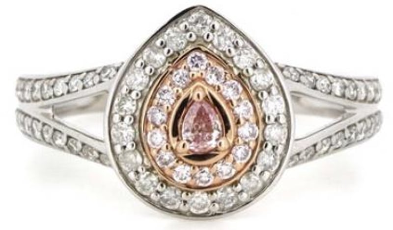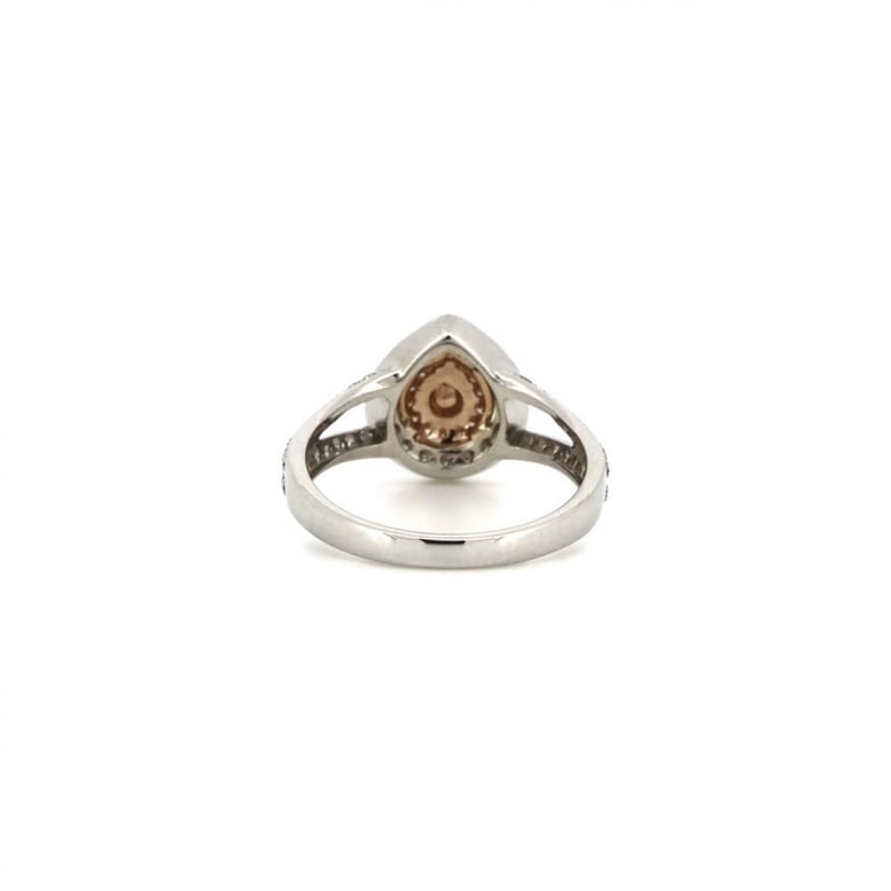 The Centre Features, One Pear Modified Brilliant Cut, Pink Champagne 3, Diamond (0.06Ct, Si2-P1 Clarity), Bezel Set. Surrounded By, 14 Round Brilliant Cut, Blush Pink, Diamonds (0.07Ct, Si2+ Clarity), Bead Set. Decorating The Outer Halo And Decorating The Band Are, 54 Round Brilliant Cut, Diamonds (0.50Ct Tdw, H-K Colour, P1+), Bead Set.