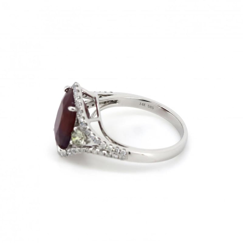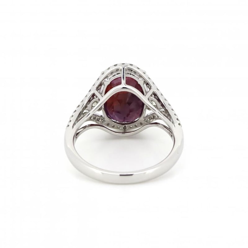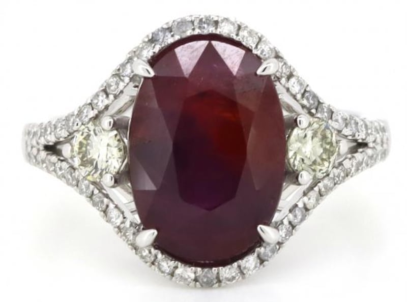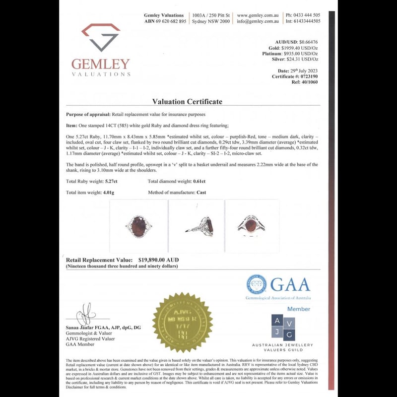The Centre Features, One Oval Cut, Purplish-Red, Ruby (5.27Ct, Included), 4 Claw Set. Flanking The Centre Are, 2 Round Brilliant Cut, Diamonds (0.29Ct Tdw, J-K Colour, I1-I2 Clarity), Claw Set. Bordering The Design Are, 54 Round Brilliant Cut, Diamonds (0.32Ct Tdw, J-K Colour, Si2-I2 Clarity), Micro-Claw Set.