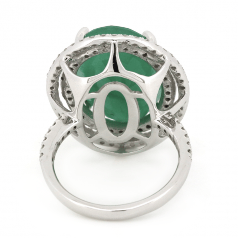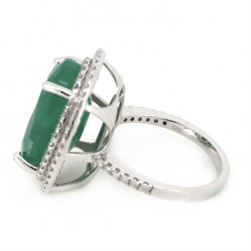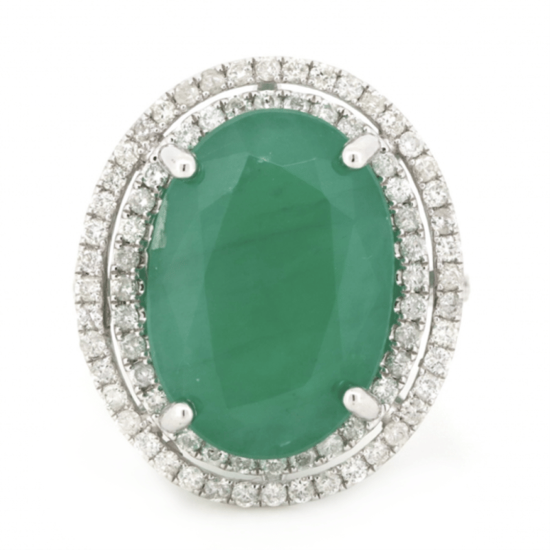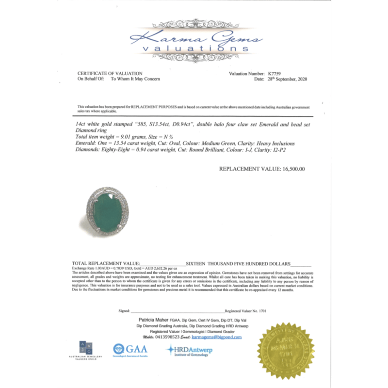 14K WHITE GOLD, 13.54CT EMERALD AND DIAMOND, STATEMENT RING. The Centre Features, One Oval Cut, Medium Green, Emerald (13.54Ct, Heavy Inclusions), Claw Set. Surrounding The Centre In A Double Halo And Decorating The Band Are, 88 Round Brilliant Cut, Diamonds (0.94Ct Tdw, I-J Colour, I2-P2 Clarity), Bead Set. Ring Size N 1/2.The Emerald Has A Natural Inclusion That Has Reached The Surface. Valuations Provided by an Independent Third-Party Professional Not Directly Associated With Lloyds Auctions at AUD $$16,500.00This valuation has been conducted by an independent third-party professional. The valuation amount is an assessment by the issuing valuer and does not reflect the auction value of the item. Any inquiries regarding the valuation should be directed to the issuing valuer (refer to contact details on the certificate), as Lloyds Auctions has no affiliation or influence over the valuation, the valuer, or the stated amount. Condition: Good - Refer Images 0645909+1633