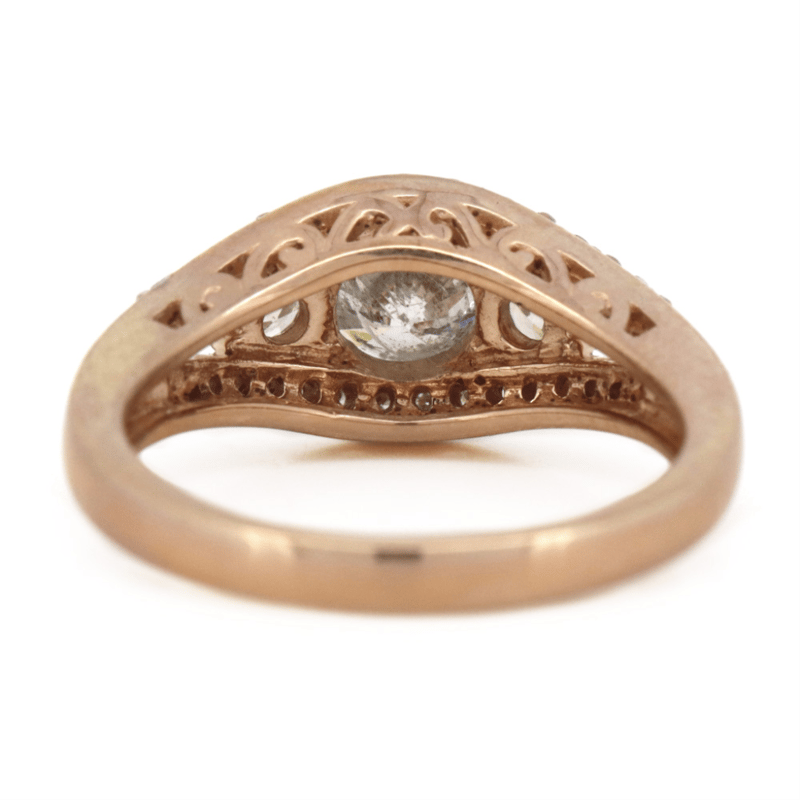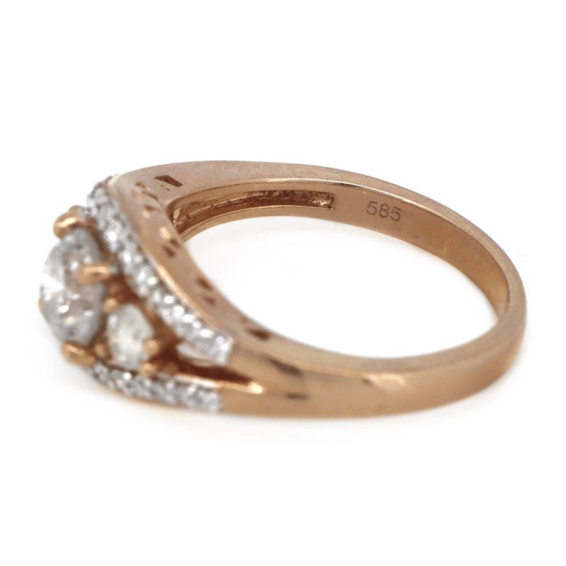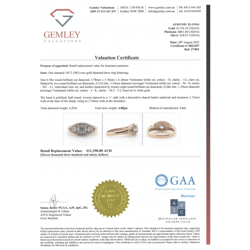 14K ROSE GOLD AND DIAMOND, TRILOGY RING. The Centre Features, One Round Brilliant Cut, Diamond (0.78Ct, N Colour, I2 Clarity), 4 Claw Set. Accompanied By, 2 Round Brilliant Cut, Diamonds (0.21Ct Tdw, M-N Colour, Si2-I1 Clarity), Claw Set. Ring Size M. Valuations Provided by an Independent Third-Party Professional Not Directly Associated With Lloyds Auctions at AUD $$11,390.00This valuation has been conducted by an independent third-party professional. The valuation amount is an assessment by the issuing valuer and does not reflect the auction value of the item. Any inquiries regarding the valuation should be directed to the issuing valuer (refer to contact details on the certificate), as Lloyds Auctions has no affiliation or influence over the valuation, the valuer, or the stated amount. Condition: Good - Refer Images 0645909+1697
