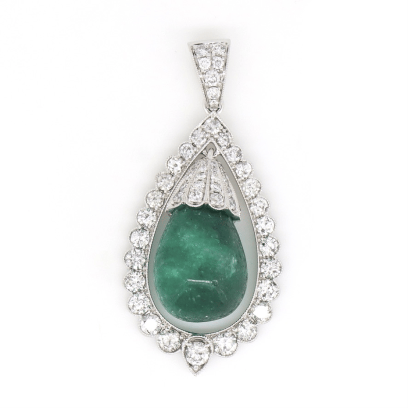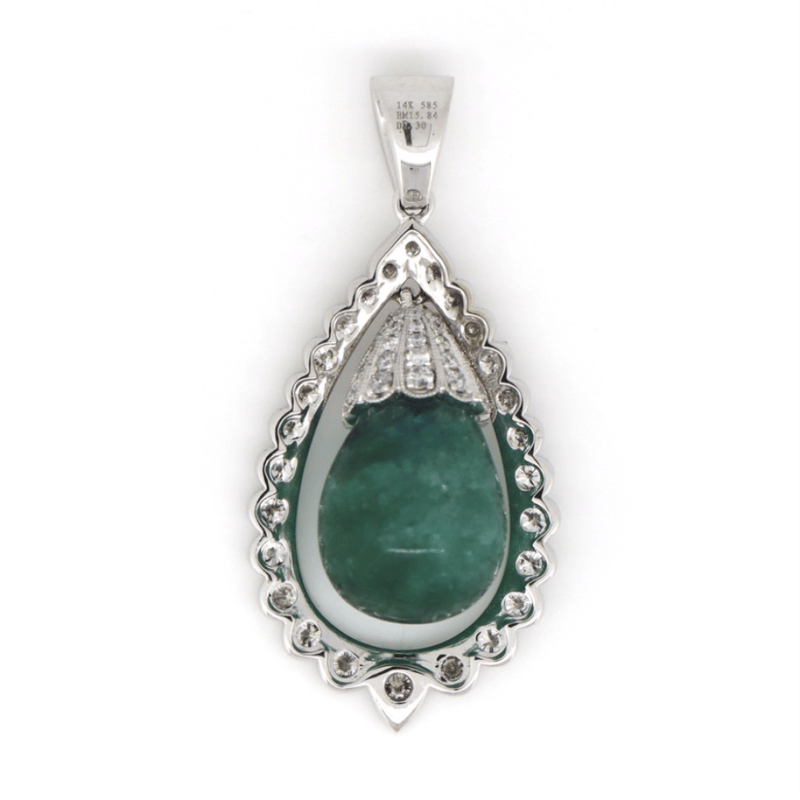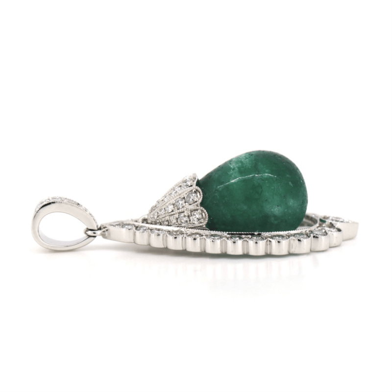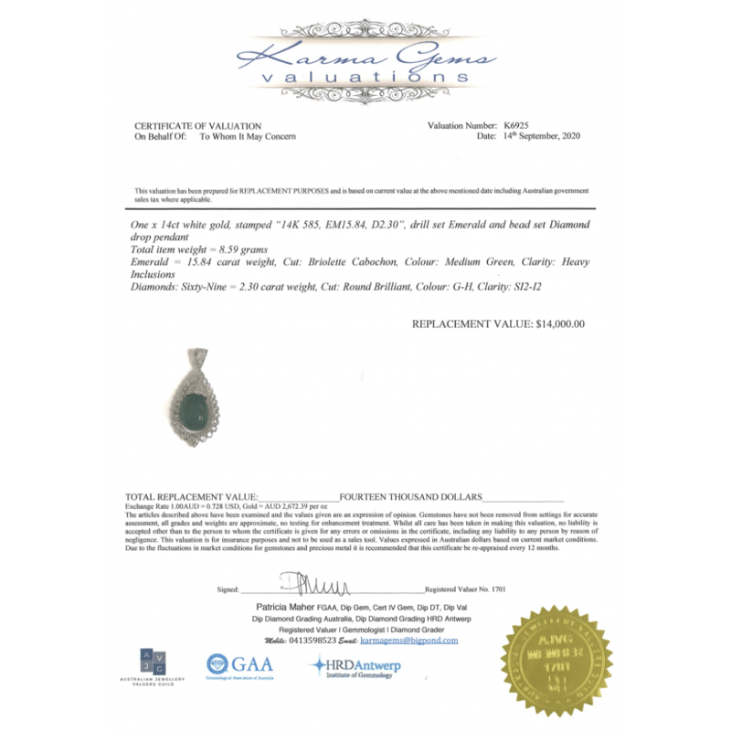 14K WHITE GOLD, EMERALD AND DIAMOND, ANTIQUE INSPIRED PENDANT. The Design Features, One Briolette Cabochon Cut, Medium Green, Emerald (15.84Ct, Heavy Inclusions), Drill Set. Surmounting The Emerald, Encompassing It In A Floating Halo And Decorating The Bail Are, 69 Round Brilliant Cut, Diamonds (2.30Ct Tdw, G-H Colour, Si2-I2 Clarity), Bead Set. Valuations Provided by an Independent Third-Party Professional Not Directly Associated With Lloyds Auctions at AUD $$14,000.00This valuation has been conducted by an independent third-party professional. The valuation amount is an assessment by the issuing valuer and does not reflect the auction value of the item. Any inquiries regarding the valuation should be directed to the issuing valuer (refer to contact details on the certificate), as Lloyds Auctions has no affiliation or influence over the valuation, the valuer, or the stated amount. Condition: Good - Refer Images 0645909+1609