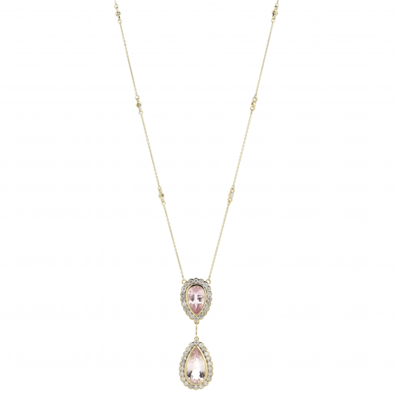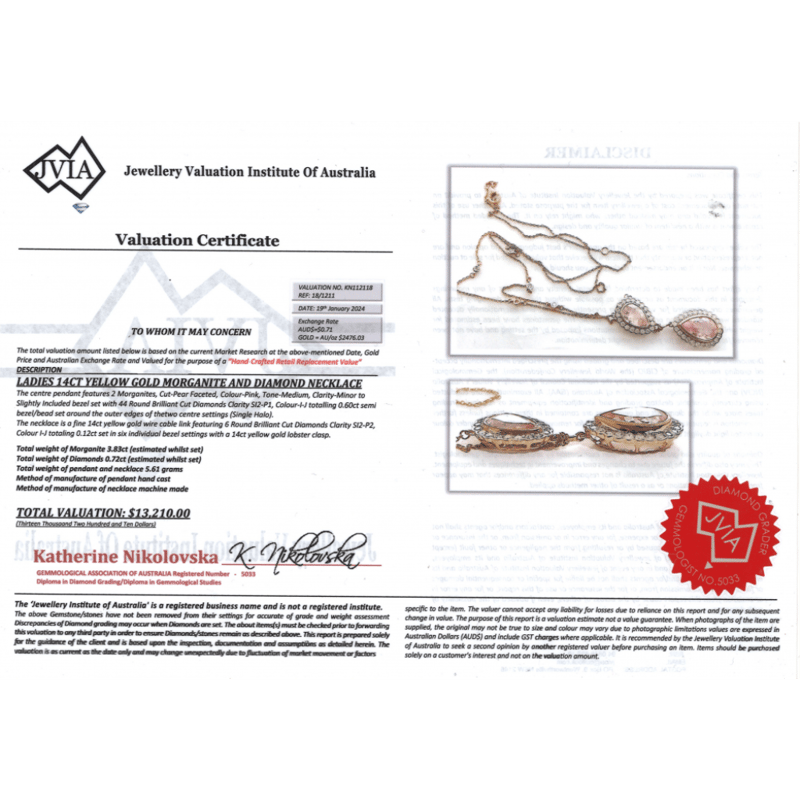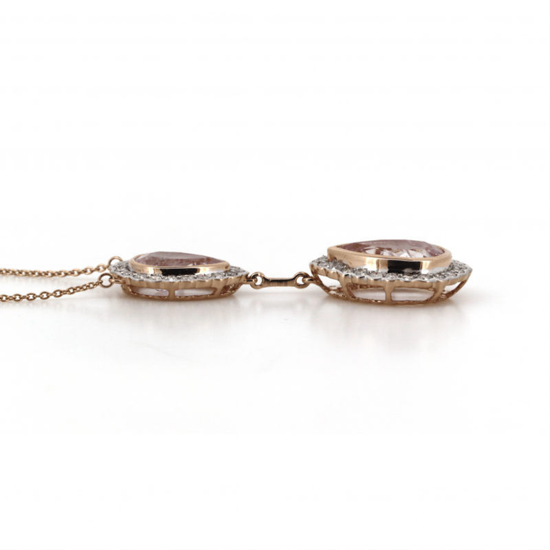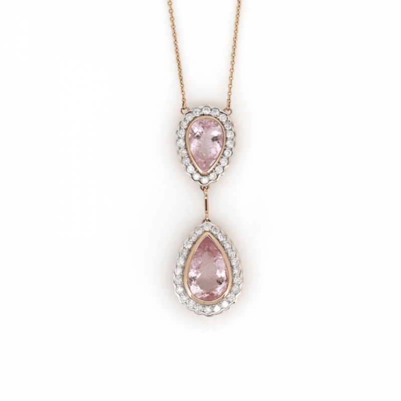 14K YELLOW GOLD, MORGANITE AND DIAMOND, DOUBLE DROP NECKLACE. The Necklace Features, 2 Pear Faceted Cut, Medium Pink, Morganites (3.83Ct Tsw, Minor-Slightly Included), Bezel Set. Surrounding The Centres In Halos And Decorating The Chain Are, 50 Round Brilliant Cut, Diamonds (0.72Ct Tdw, I-J Colour, Si2-P2 Clarity), Bezel/Bead/Claw Set In White Gold. The Necklace Has A Lobster Claw Clasp. Necklace Length Is 54Cm. Valuations Provided by an Independent Third-Party Professional Not Directly Associated With Lloyds Auctions at AUD $$13,210.00This valuation has been conducted by an independent third-party professional. The valuation amount is an assessment by the issuing valuer and does not reflect the auction value of the item. Any inquiries regarding the valuation should be directed to the issuing valuer (refer to contact details on the certificate), as Lloyds Auctions has no affiliation or influence over the valuation, the valuer, or the stated amount. Condition: Good - Refer Images 0645909+1631