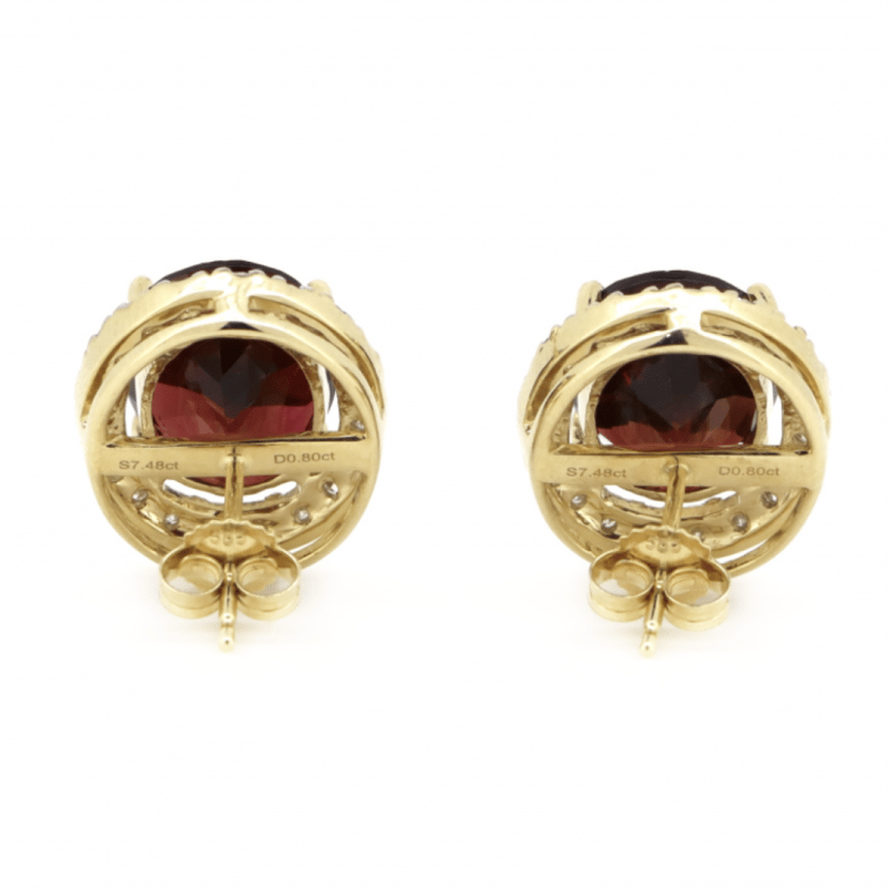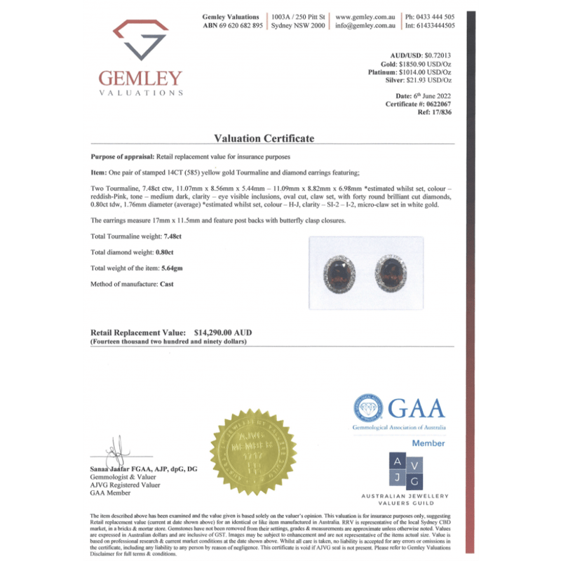 14K YELLOW GOLD, RED TOURMALINE AND DIAMOND, HALO STUD EARRINGS. The Centres Feature, 2 Oval Cut, Reddish-Pink, Tourmalines (7.48Ct Tsw, Eye Visible Inclusions), 4 Claw Set. Surrounding The Centres In Halos Are, 40 Round Brilliant Cut, Diamonds (0.80Ct Tdw, H-J Colour, Si2-I2 Clarity), Micro-Claw Set In White Gold. The Earrings Have Post Backs With 14K Yellow Gold Butterfly Clasps. Valuations Provided by an Independent Third-Party Professional Not Directly Associated With Lloyds Auctions at AUD $$14,290.00This valuation has been conducted by an independent third-party professional. The valuation amount is an assessment by the issuing valuer and does not reflect the auction value of the item. Any inquiries regarding the valuation should be directed to the issuing valuer (refer to contact details on the certificate), as Lloyds Auctions has no affiliation or influence over the valuation, the valuer, or the stated amount. Condition: Good - Refer Images 0645909+1646