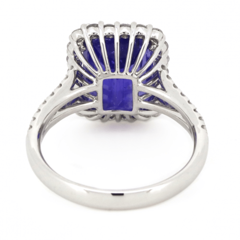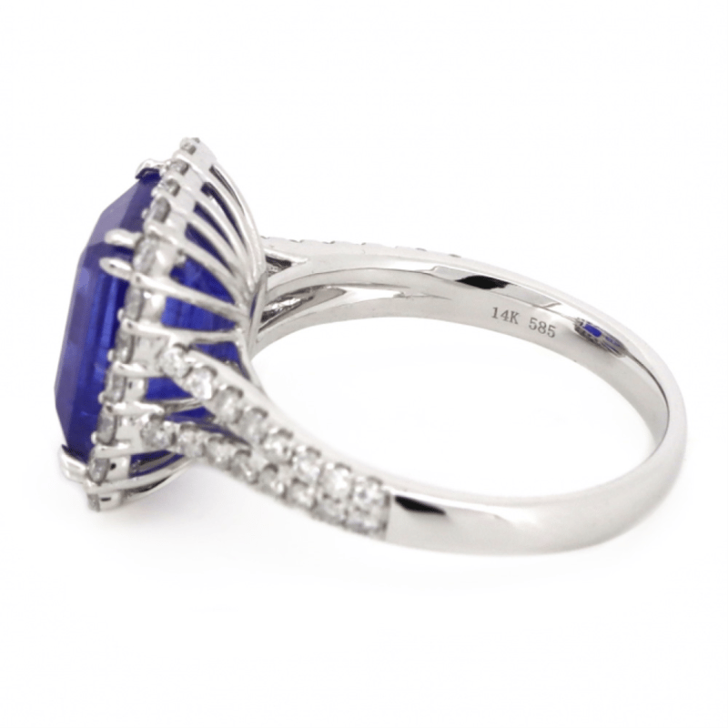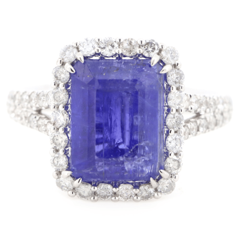 14K WHITE GOLD, TANZANITE AND DIAMOND, HALO SPLIT BAND RING. The Centre Features, One Emerald Cut, Medium Dark Purplish-Blue, Tanzanite (5.49Ct, Moderate Eye Visible Inclusions), Double Claw Set. Surrounding The Centre In A Halo And Decorating The Band Are, 54 Round Brilliant Cut, Diamonds (0.69Ct Tdw, J-K Colour, Si2-I2 Clarity), Micro-Claw Set. Ring Size M.The Tanzanite Has Some Natural Inclusions That Have Reached The Surface. Valuations Provided by an Independent Third-Party Professional Not Directly Associated With Lloyds Auctions at AUD $$11,490.00This valuation has been conducted by an independent third-party professional. The valuation amount is an assessment by the issuing valuer and does not reflect the auction value of the item. Any inquiries regarding the valuation should be directed to the issuing valuer (refer to contact details on the certificate), as Lloyds Auctions has no affiliation or influence over the valuation, the valuer, or the stated amount. Condition: Good - Refer Images 0645909+1644